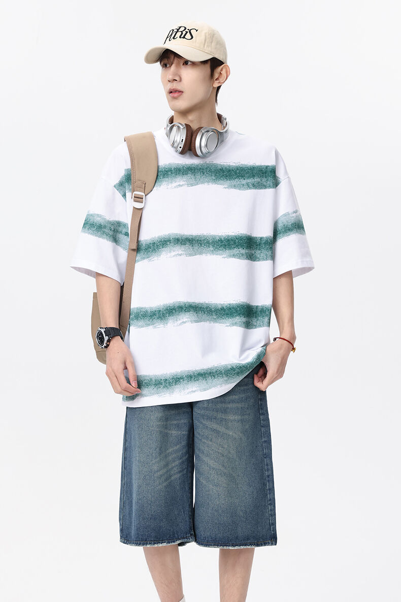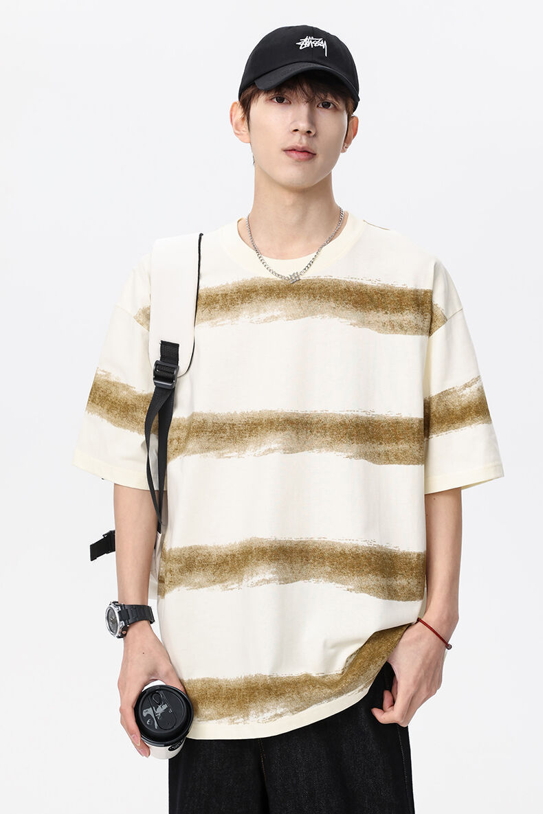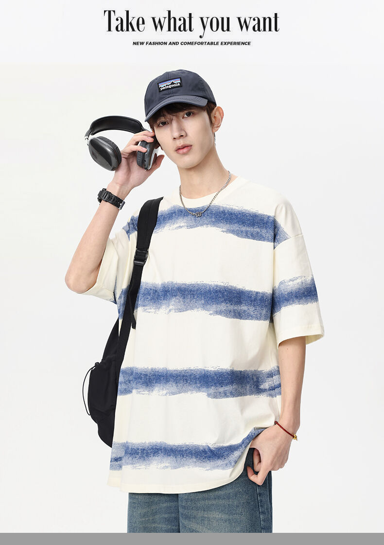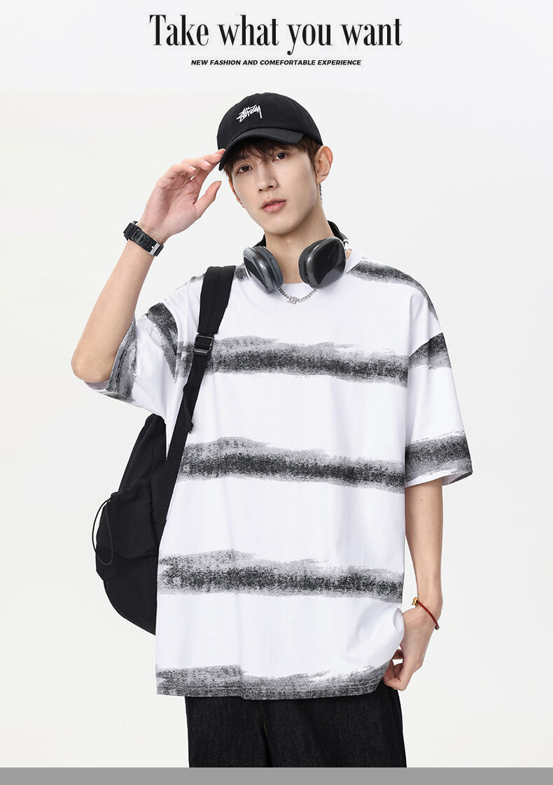 2025 년 여름 새 라운드 넥 스트라이프 반팔 스포츠 트렌디 브랜드 남성 루즈 라이트 성숙한 유행 남성 및 여성 티셔츠 한국 스타일