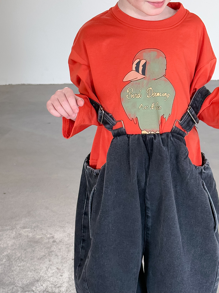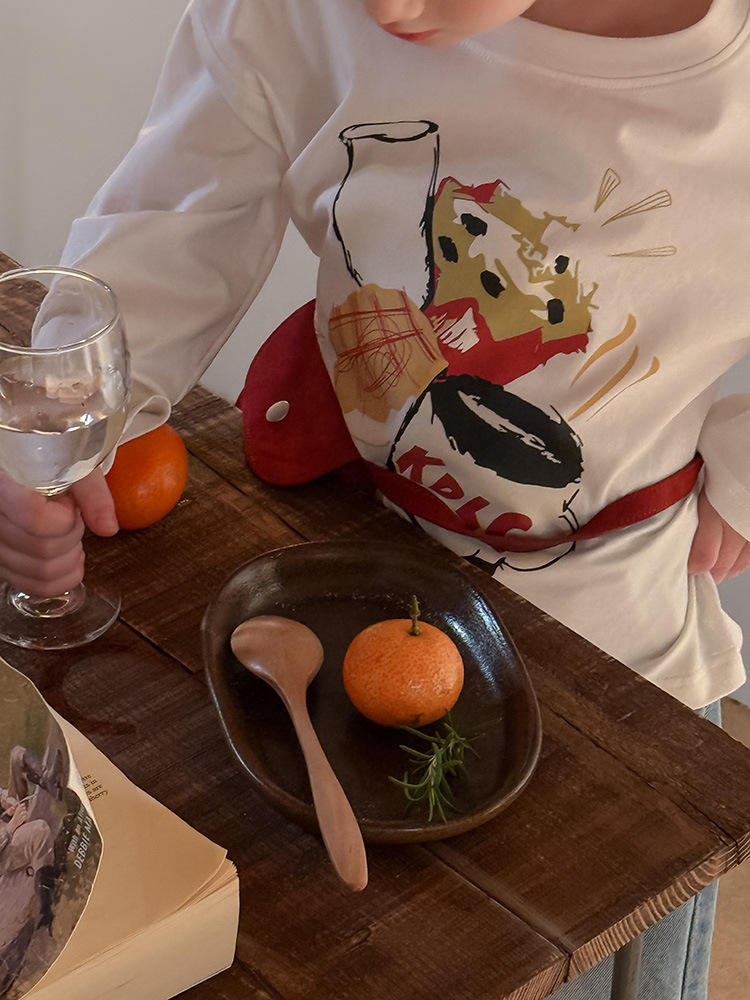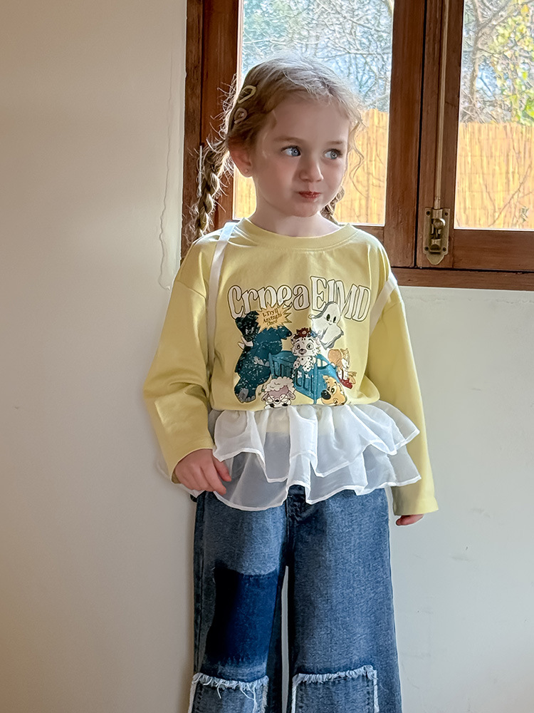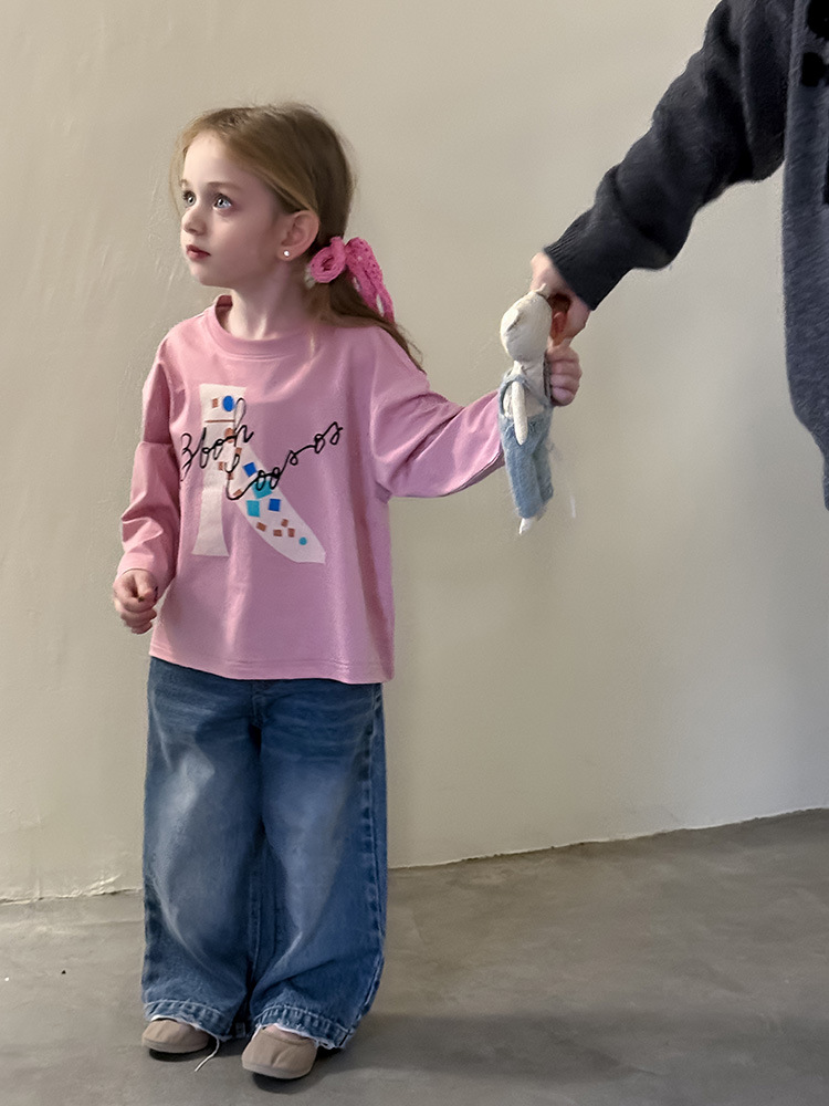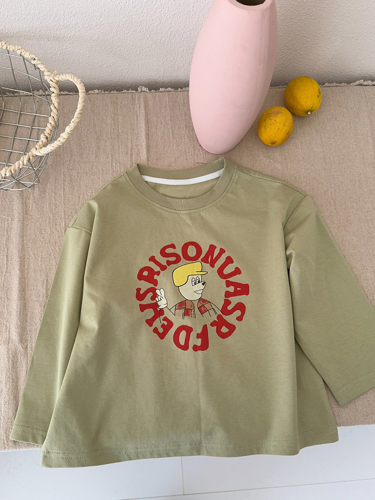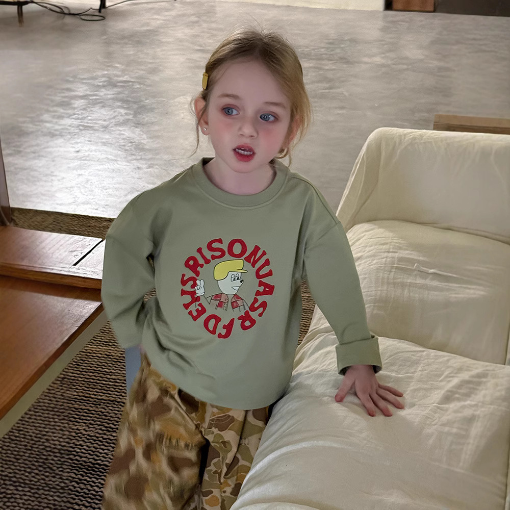 어린이 만화 멀티 컬러 티셔츠 2025 봄과 여름 새로운 한국어 스타일 소년과 소녀 만화 패턴 긴 소매 라운드 넥 티셔츠