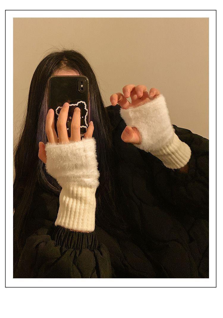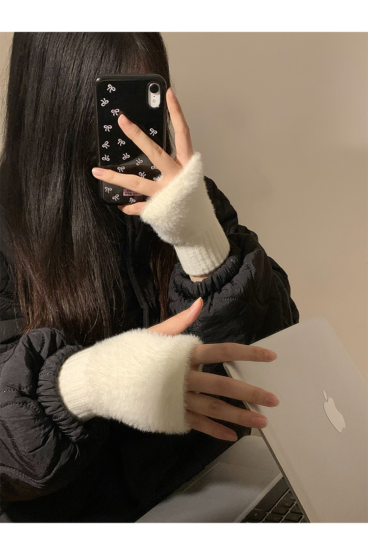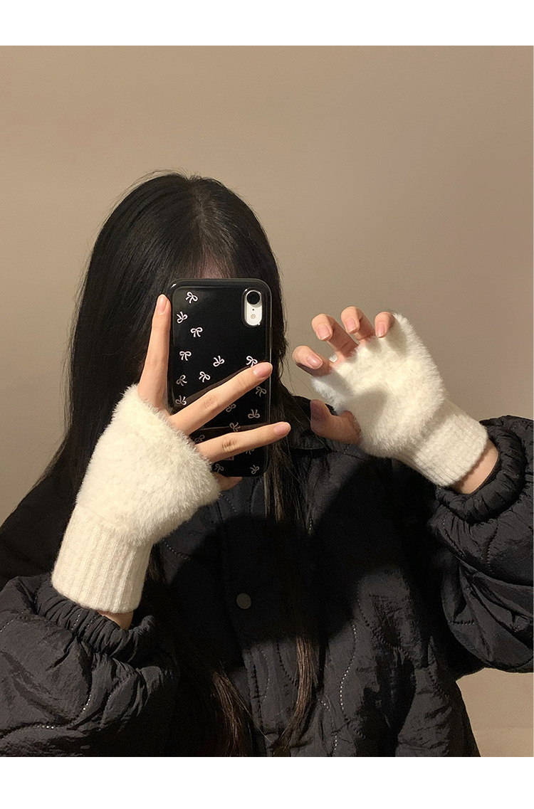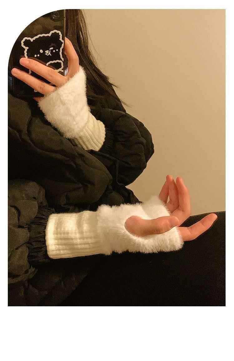 여성을위한 하프 핑거 모피 장갑 겨울 겨울 화이트 모피 플러시 오픈 핑거 솔리드 컬러 따뜻한 플러스 벨벳 긴 소매