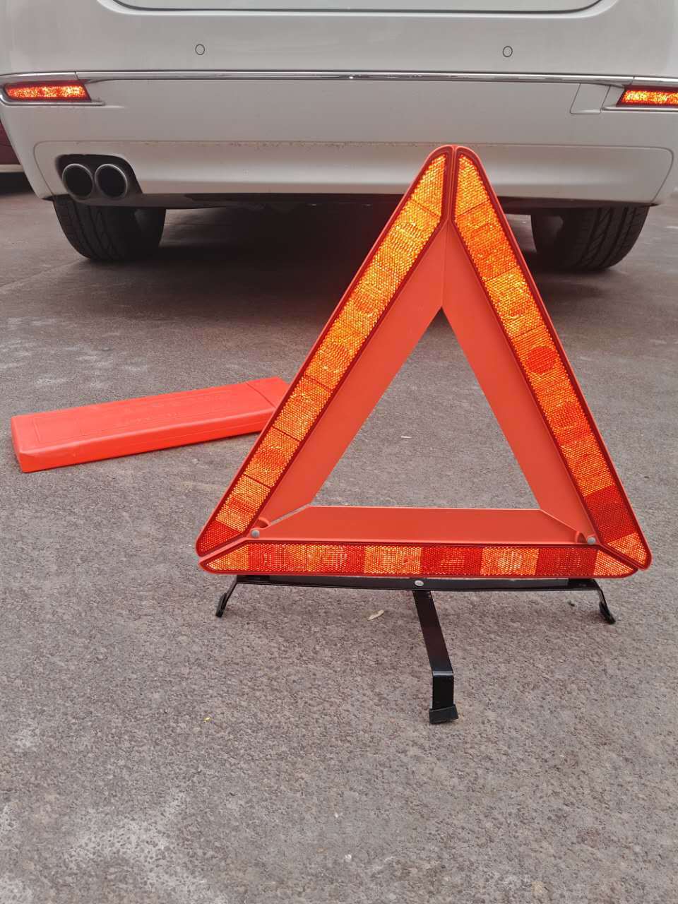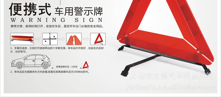 【产品介绍】1、出门行车,难免会遇到车出问题的时候,在高速公路上或者夜晚车忽然抛锚...这时,你一定需要这个非常时的停车三角指示牌。2、边长为435mm 的大三角型,带反光材料,符合欧洲E13标准,够醒目,牢固的折叠式金属底座支架,可平整贴合路面,稳定性。3、反光牌为折叠式设计,PP硬盒包装,安装十分方便,确保您的停车。