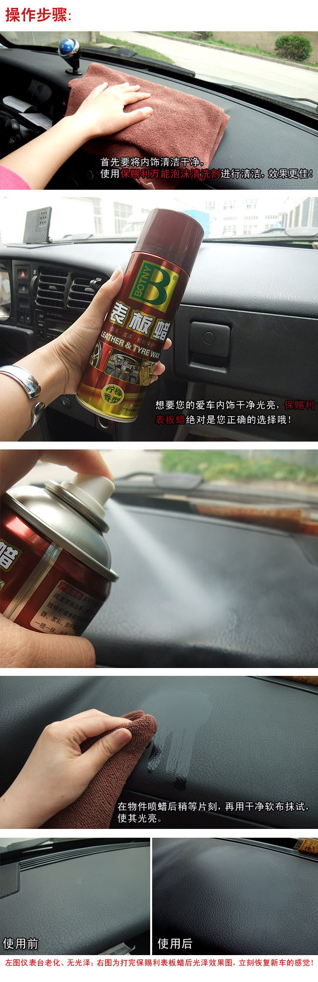 适用于车辆仪表板、皮革座椅、合成皮革制品等,增加表面光泽、去污除尘。独特柠檬香味带来自然感受,也可以适用于家用电器、家私、塑料制品的上光。真正呵护爱车。一喷一抹,去污、上光一次完成。