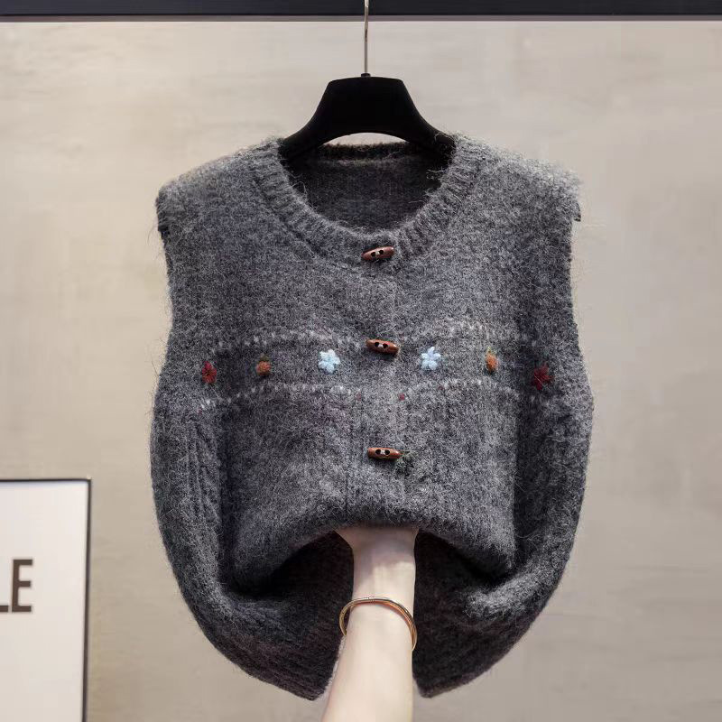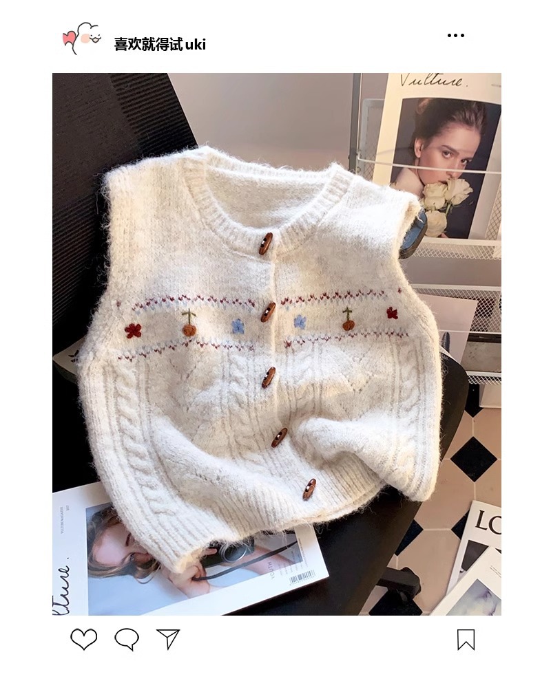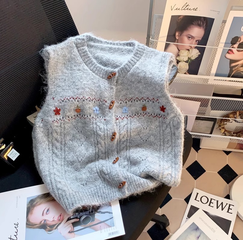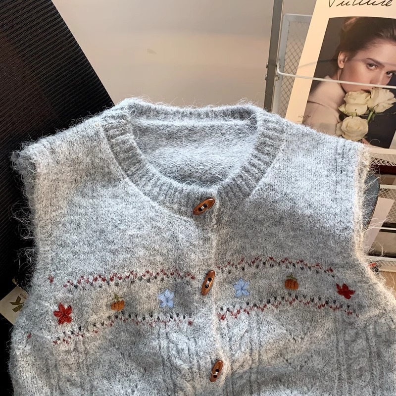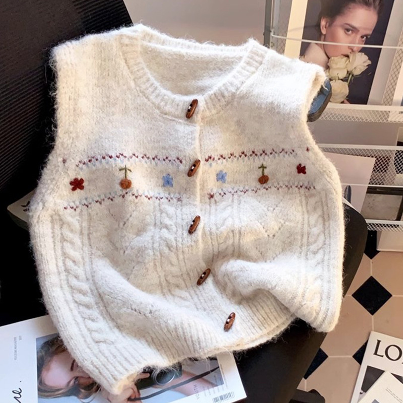 빈티지 니트 조끼 여성 수제 꽃 스웨터 웨이스트 코트 조끼 라운드 넥 스택 달콤한 자카드 조끼 올 매치 트렌디스토어 가기