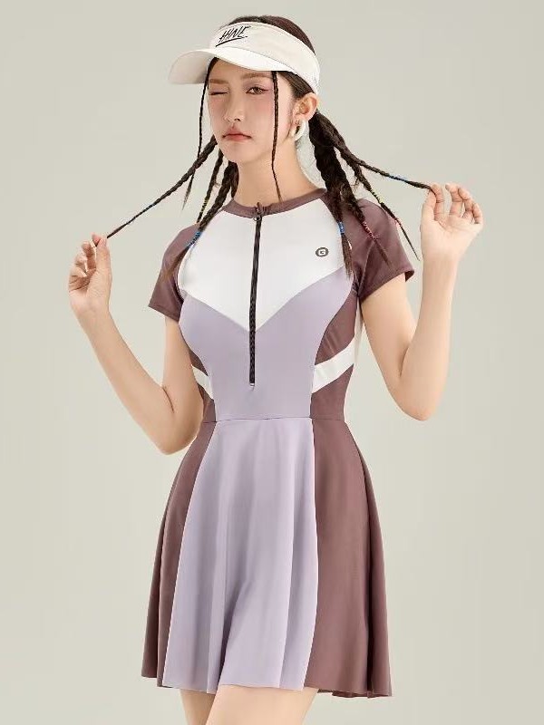 2025 새로운 여성 스커트 스타일 원피스 작은 신선한 여성 수영 세트 보수적 인 슬림 짧은 소매 스포츠 프로 수영 세트