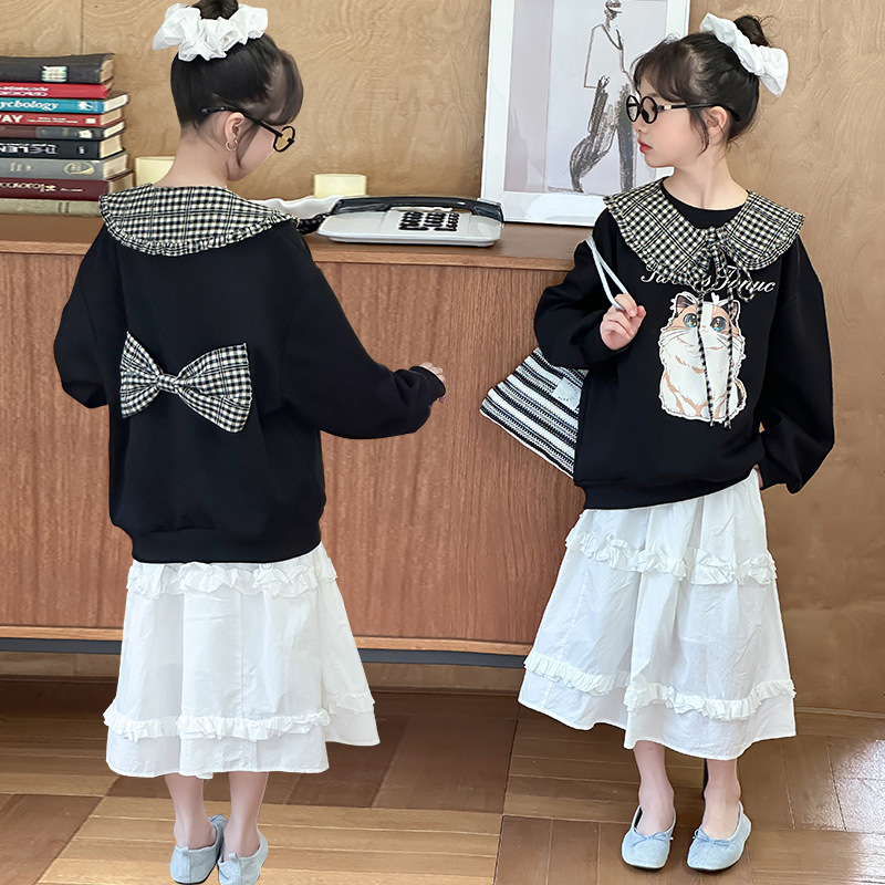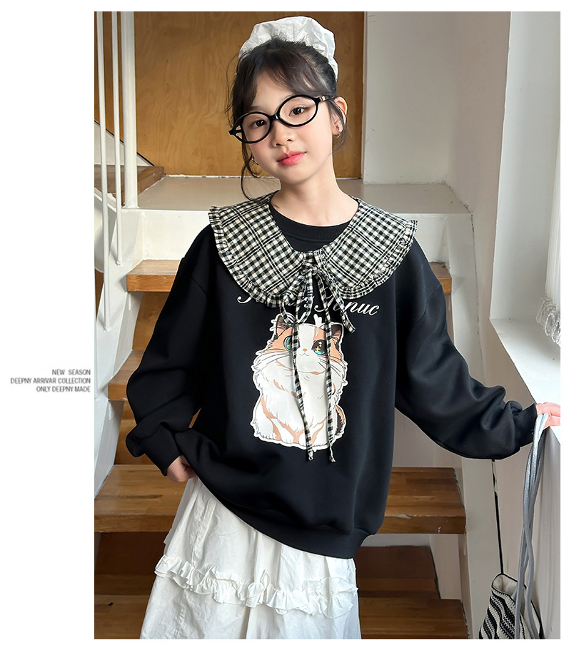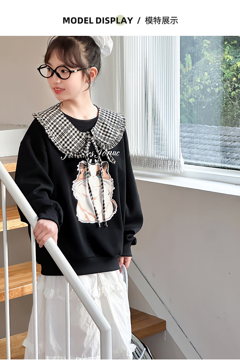 소녀 새 스웨트 셔츠 2025 봄 인쇄 라운드 넥 캐주얼 느슨한 틈새 셔츠 고양이 스웨트 셔츠 만화 그림
