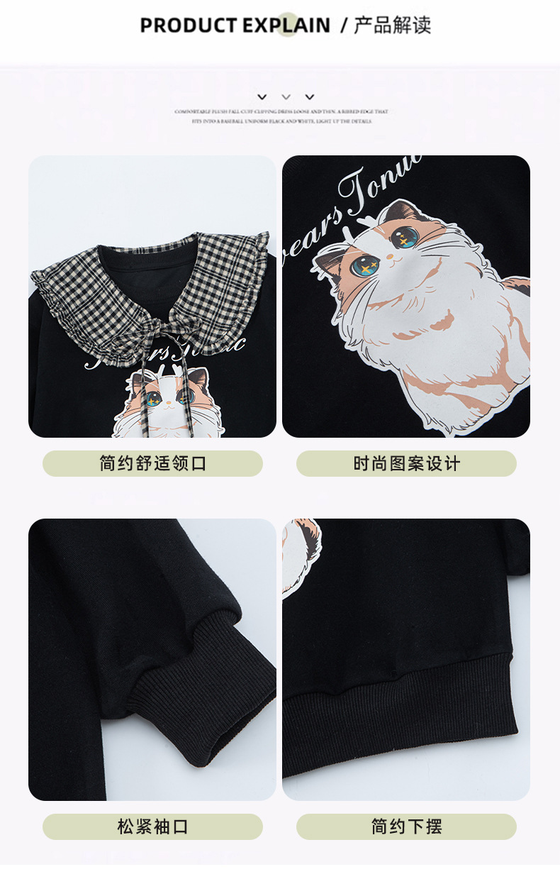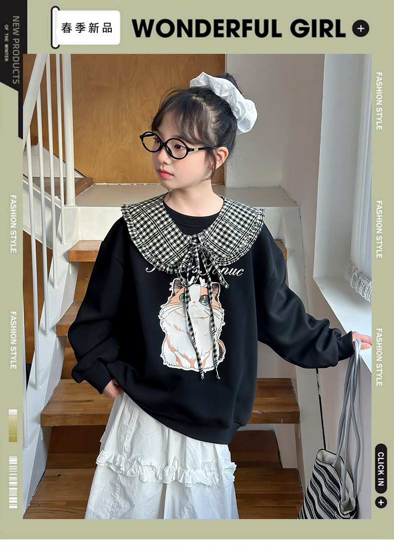 소녀 새 스웨트 셔츠 2025 봄 인쇄 라운드 넥 캐주얼 느슨한 틈새 셔츠 고양이 스웨트 셔츠 만화 그림스토어 가기