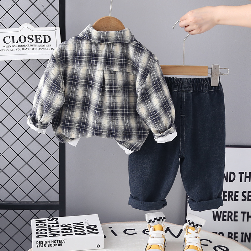 소년의 봄 세트 2025 새로운 세련된 격자 무늬 셔츠 소년 잘 생긴 패션 캐주얼 바지 3 피스 세트스토어 가기