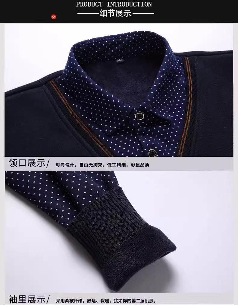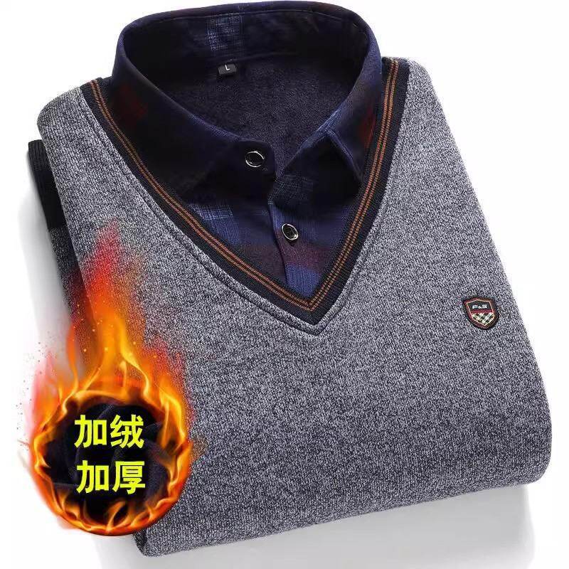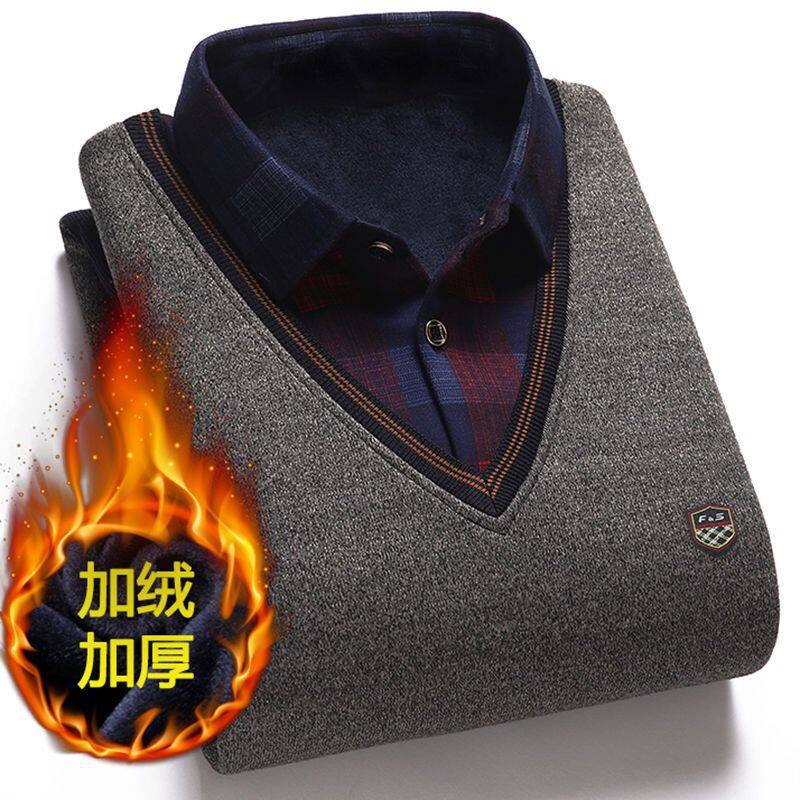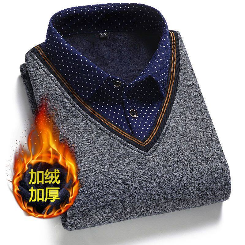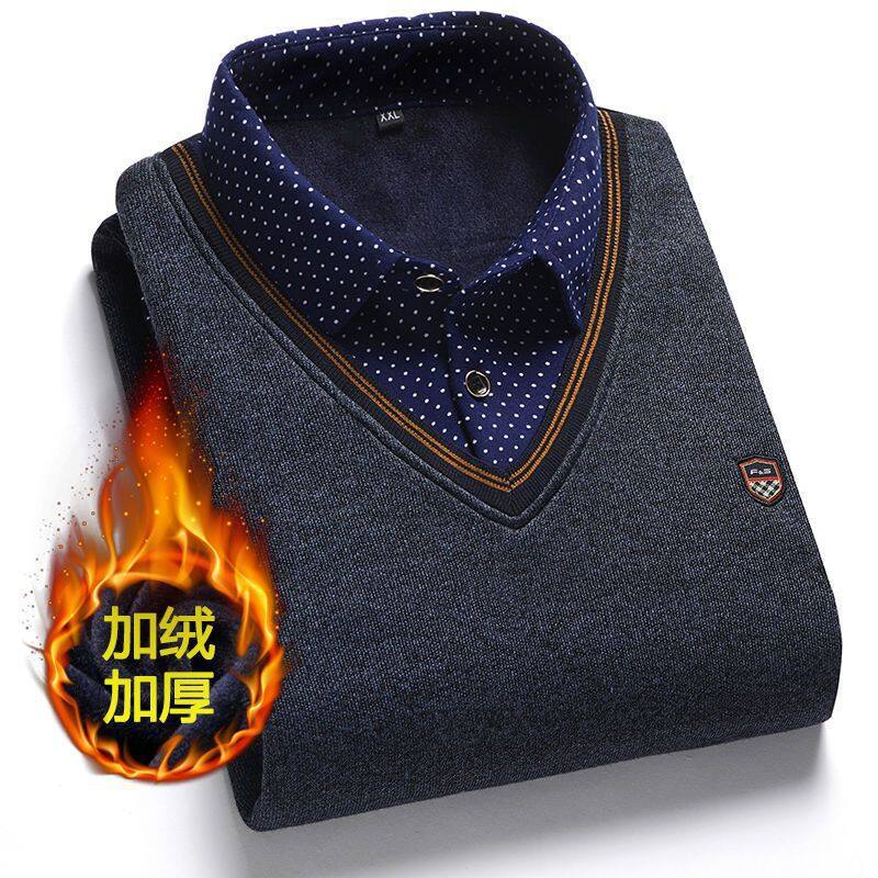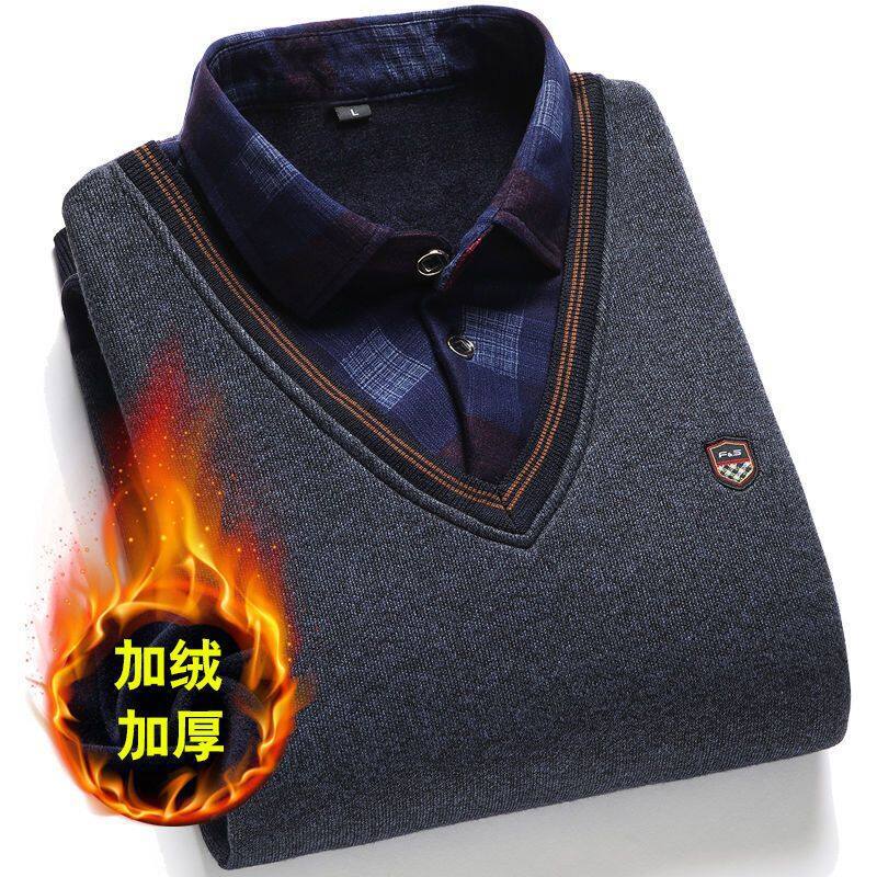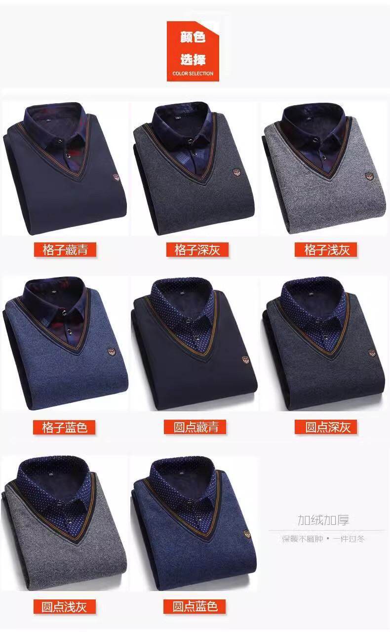 ZM 가을과 겨울 남자 기모 두꺼운 가짜 투피스 스웨터 라이트 그레이 격자 무늬 다크 그레이 라이트 그레이 점 다크 그레이 점