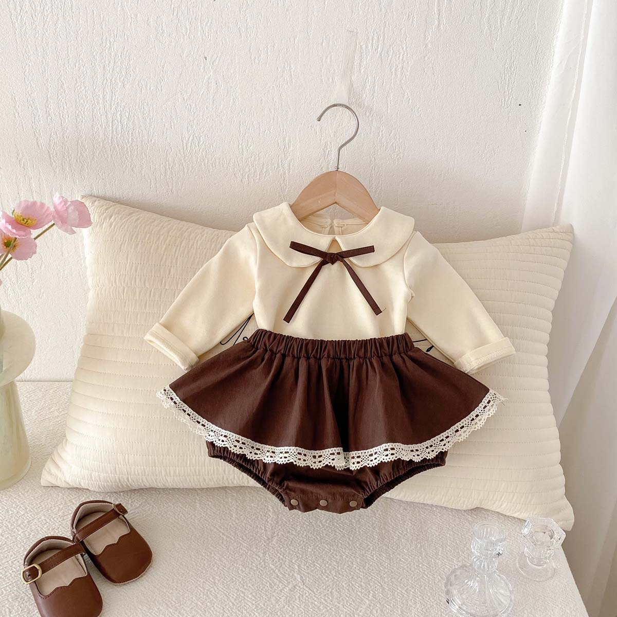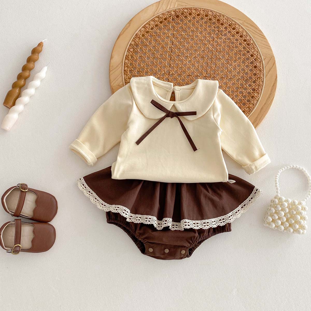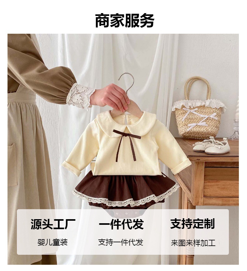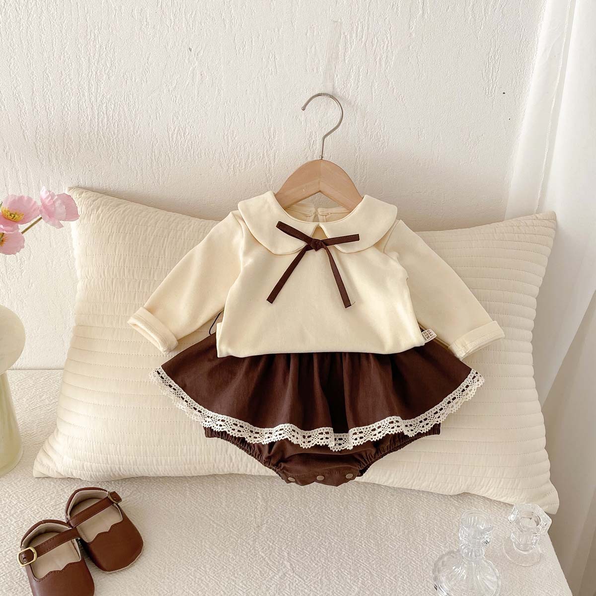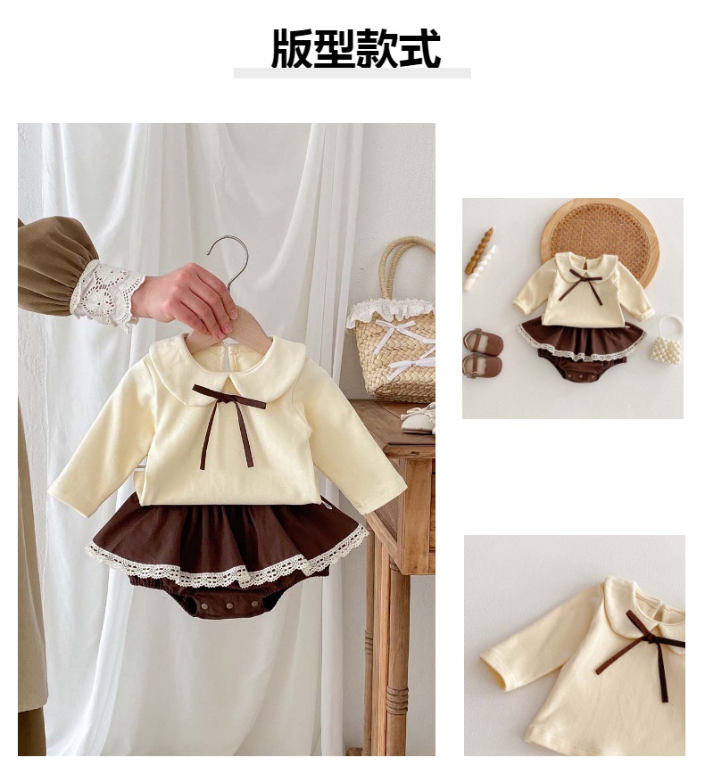 봄 새로운 아기 소녀 달콤한 세트 아기 활 옷깃 긴 소매 셔츠 레이스 랩 엉덩이 스커트 바지 투피스 세트스토어 가기
