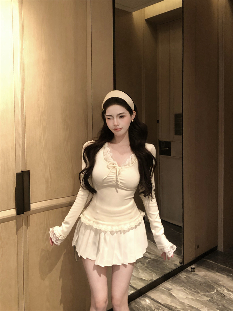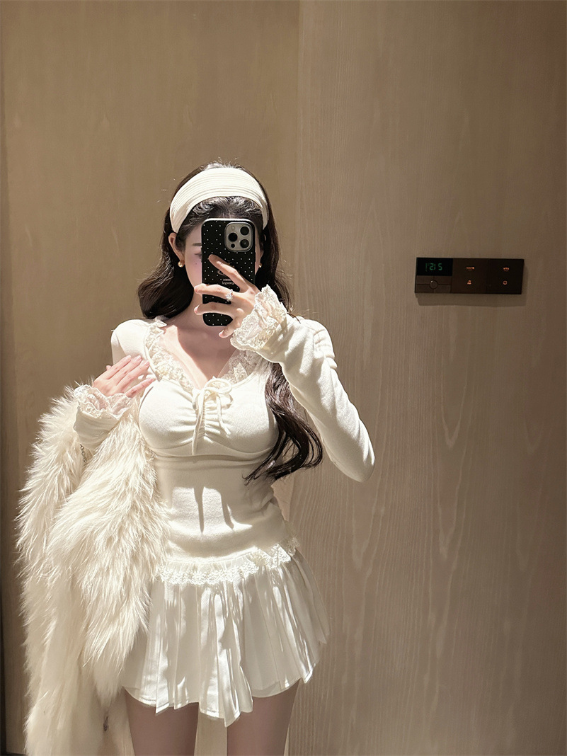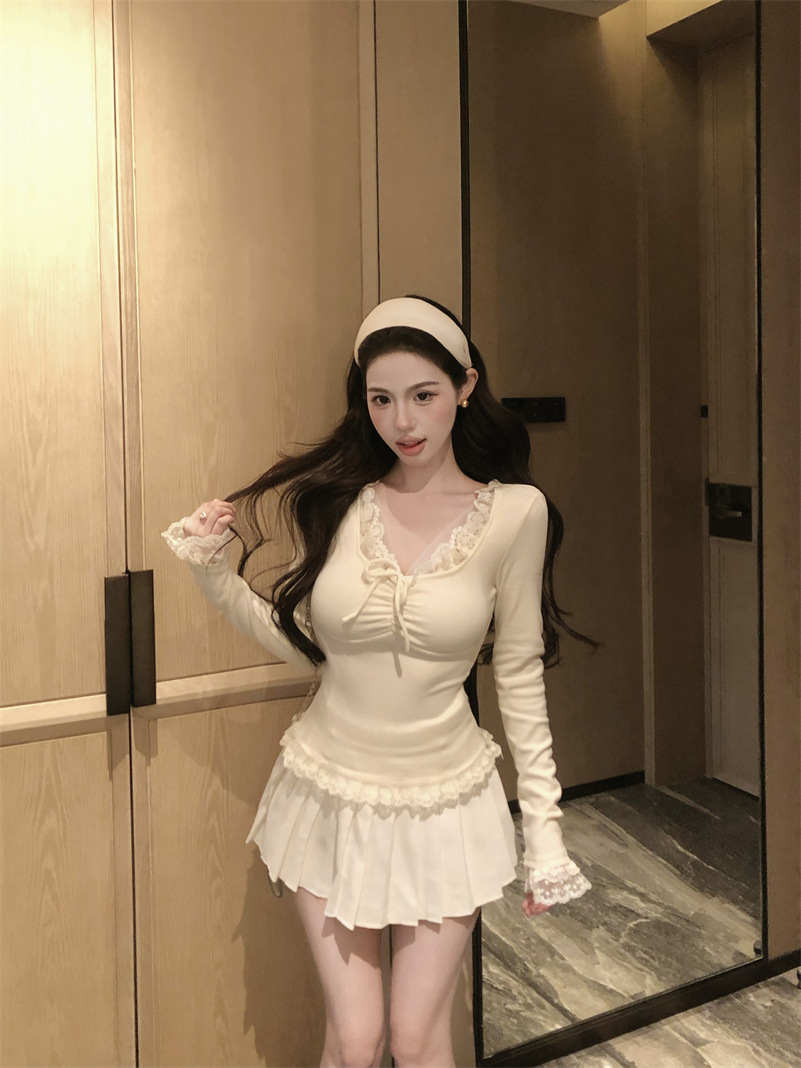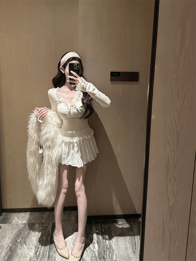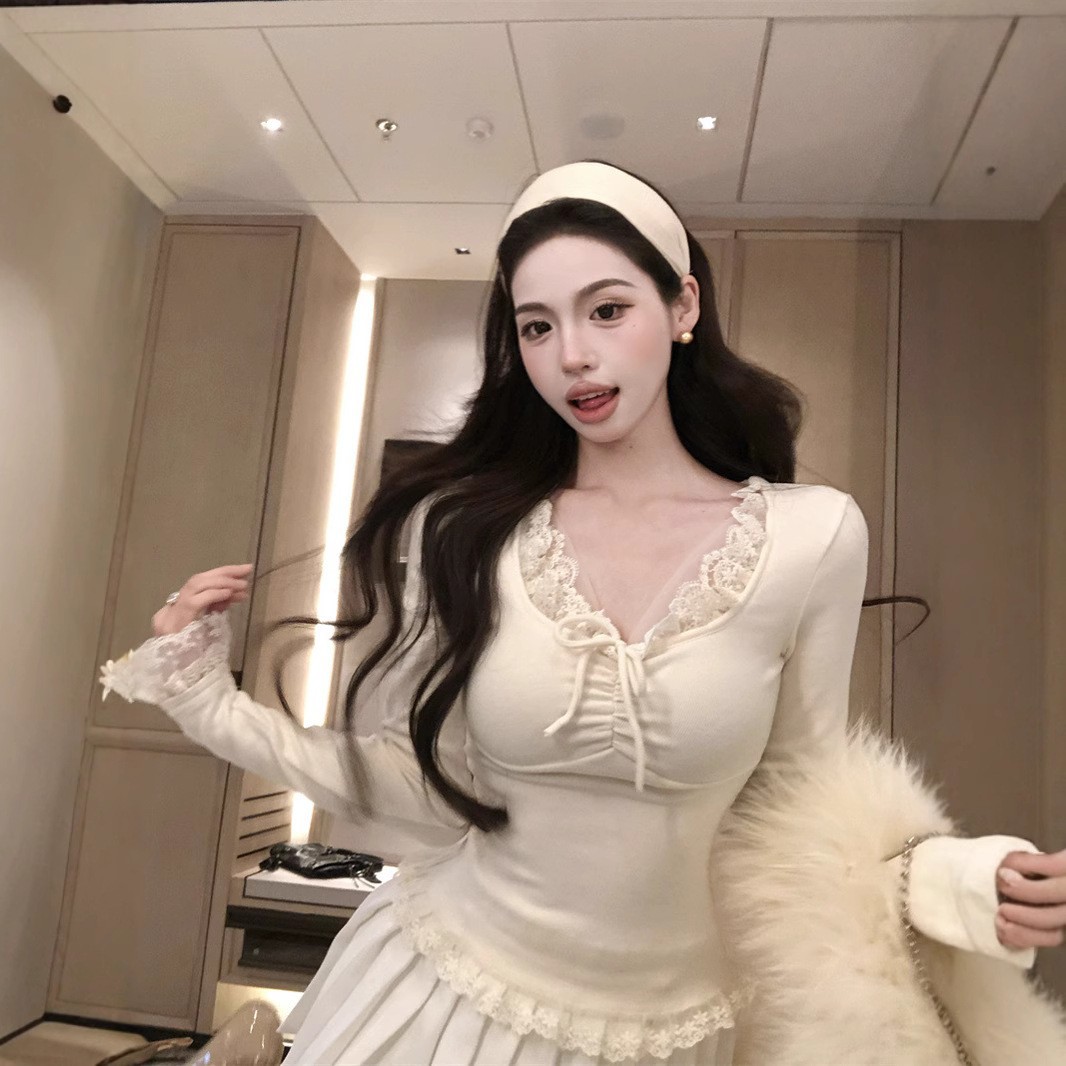 순수한 섹시한 V 넥 살구색 최고의 여성 가을 및 겨울 부드러운 샤넬 스타일 레이스베이스 셔츠 겨울 내부 착용 외부 착용