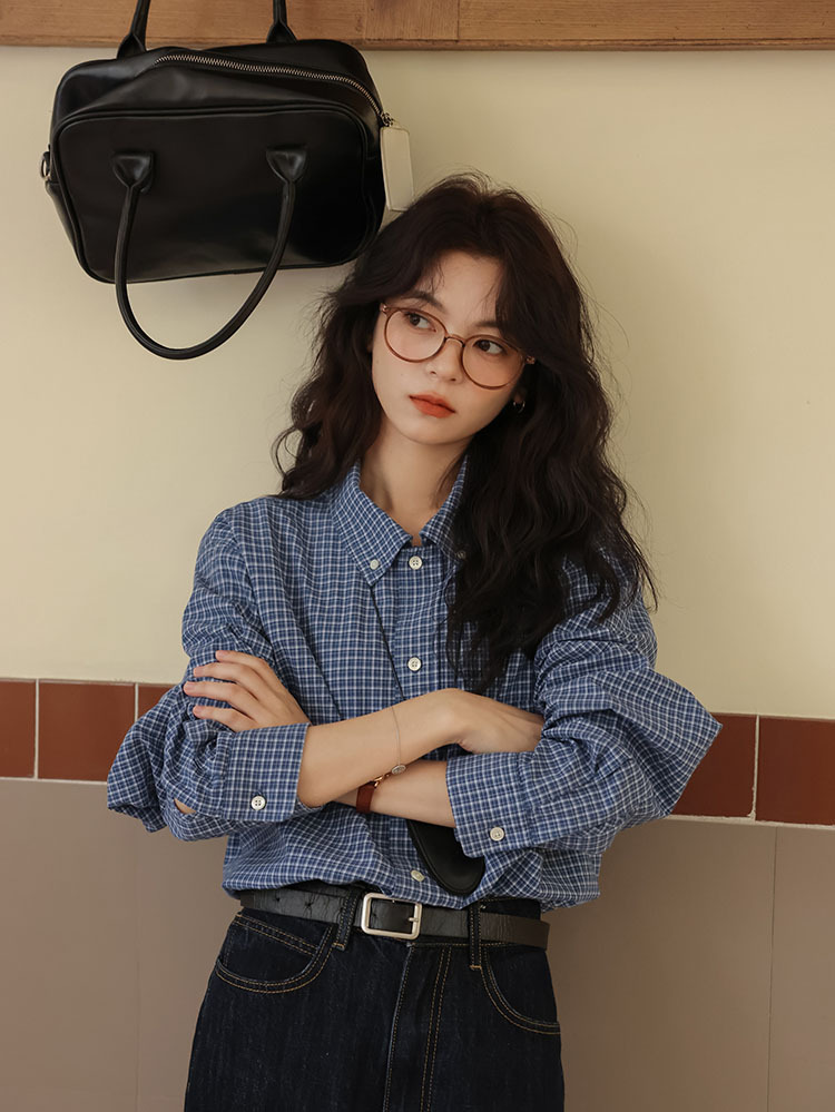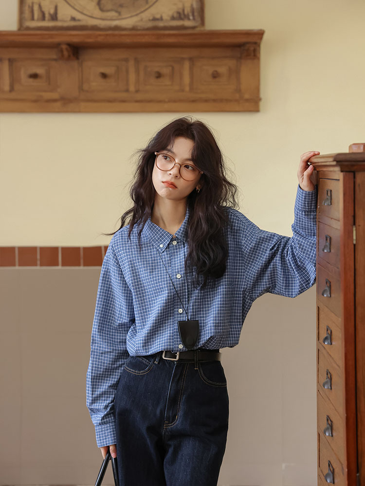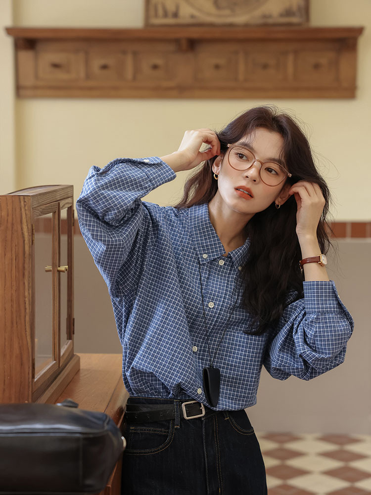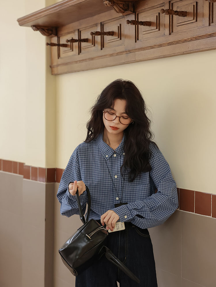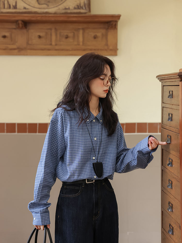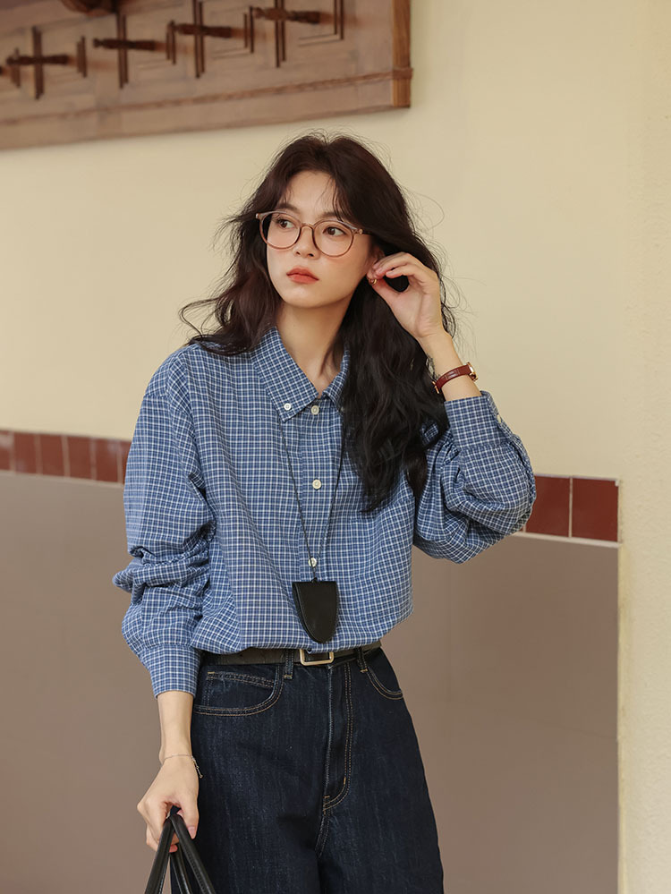 봄 2025 새로운 일본 스타일 예술적 우아한 쌓인 착용 디자인 긴 소매 엘 블루 격자 무늬 셔츠 탑스토어 가기