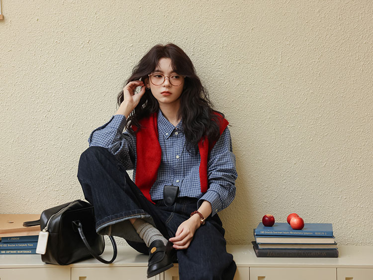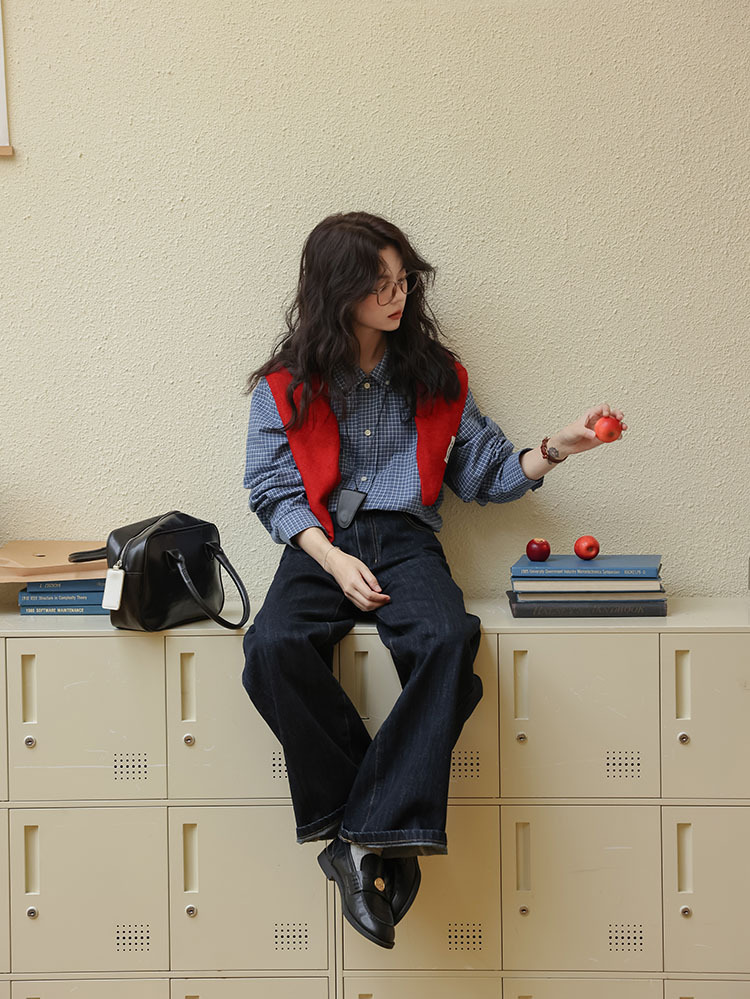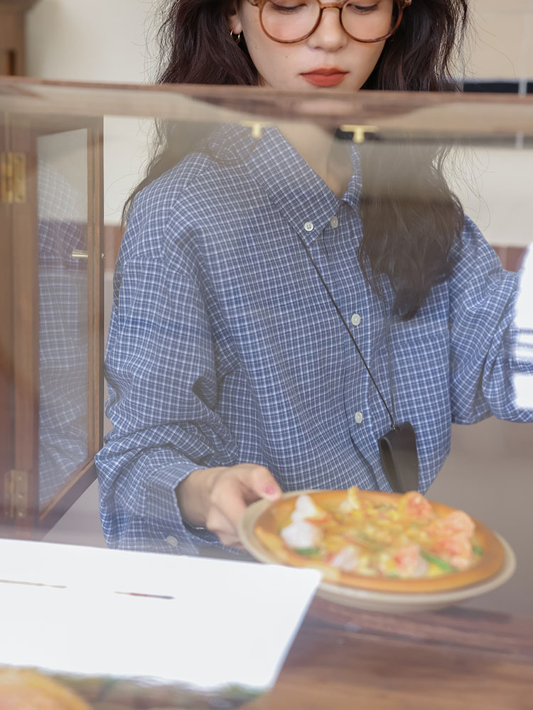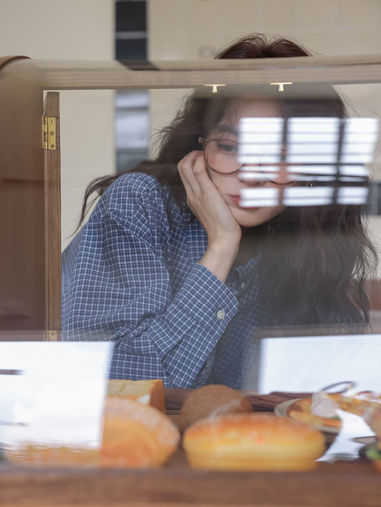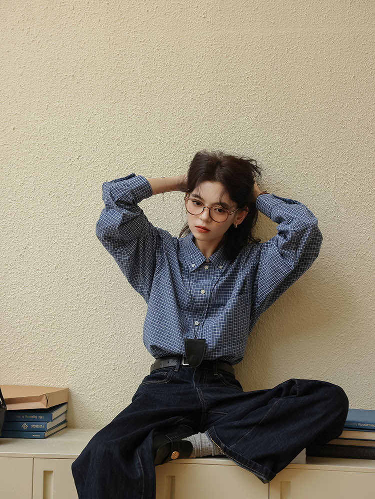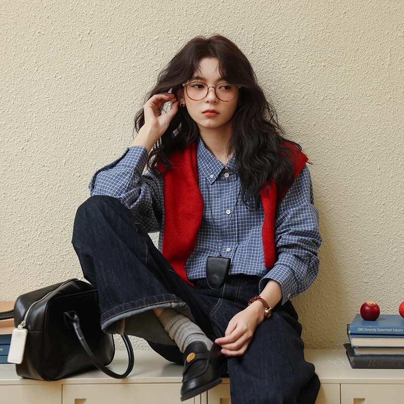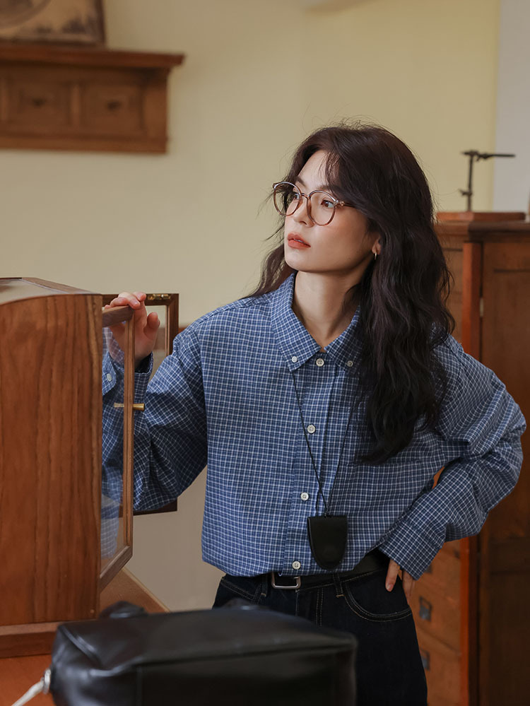봄 2025 새로운 일본 스타일 예술적 우아한 쌓인 착용 디자인 긴 소매 엘 블루 격자 무늬 셔츠 탑스토어 가기