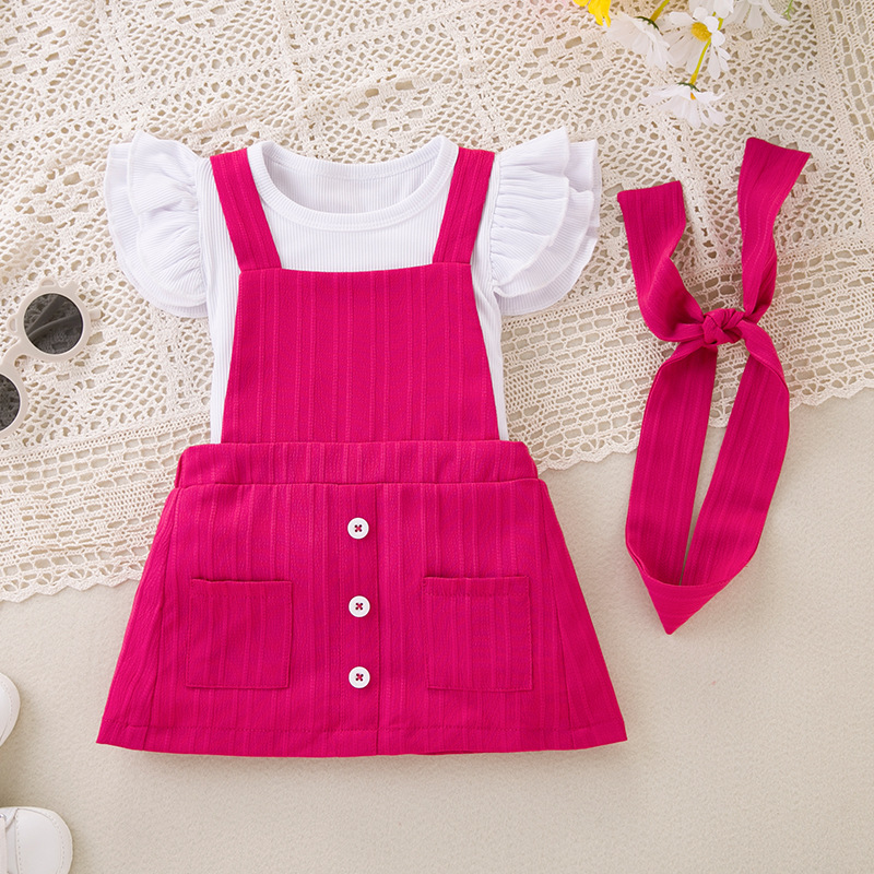 여아복, 유아반팔탑, 멜빵바지, 헤어장식, 3종세트, 핏스트립 플라잉슬리브 티셔츠, 멜빵스커트, 외출복