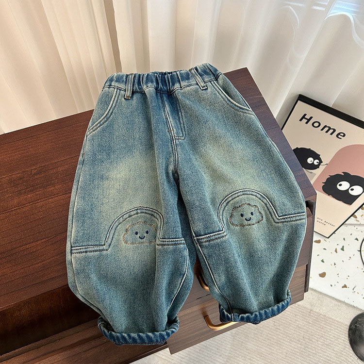 한 청바지 겨울 어린이 수 놓은 바지를 기모 남학생과 여학생을위한 가을과 겨울 새로운 벨벳 데님 바지