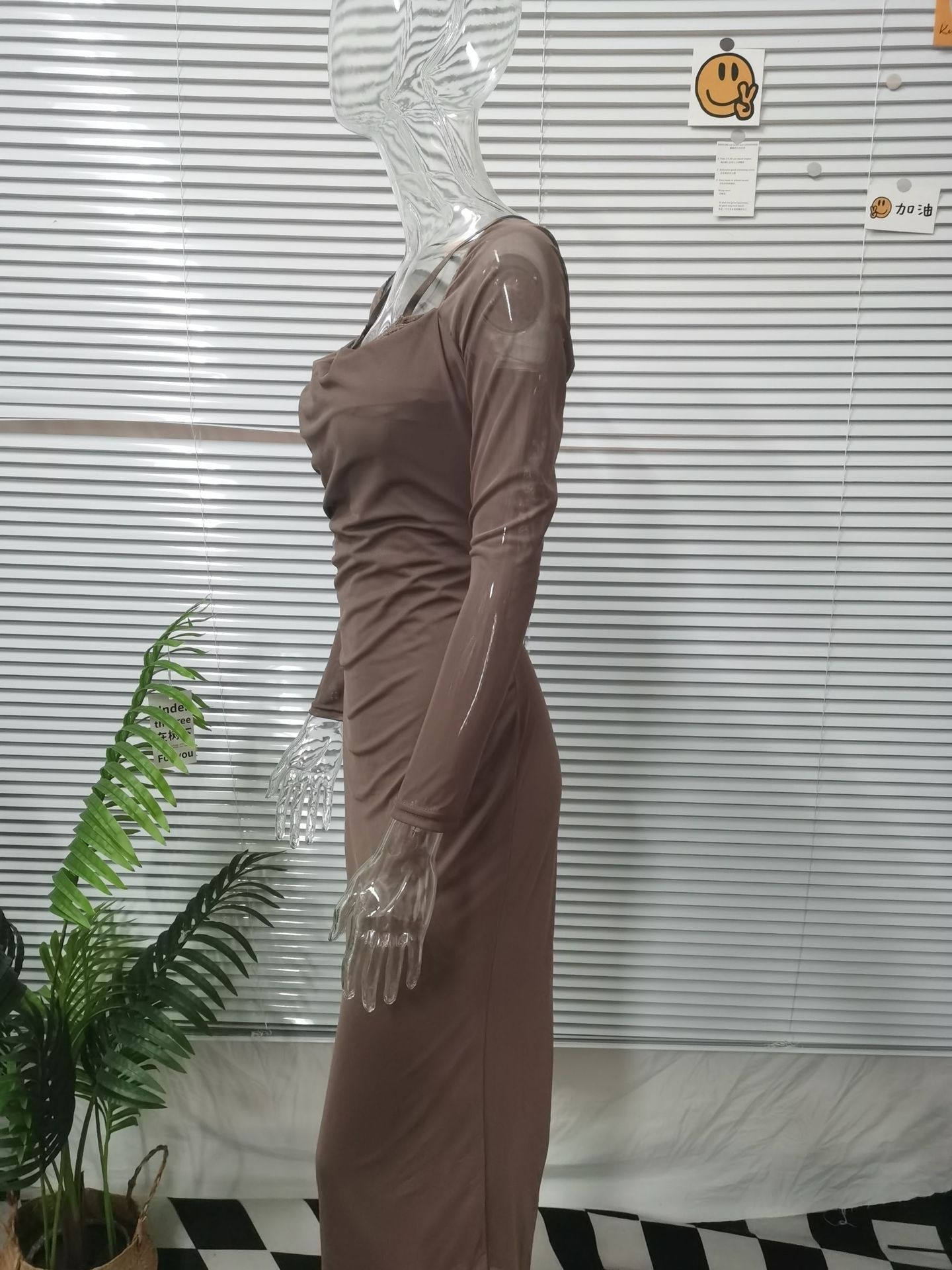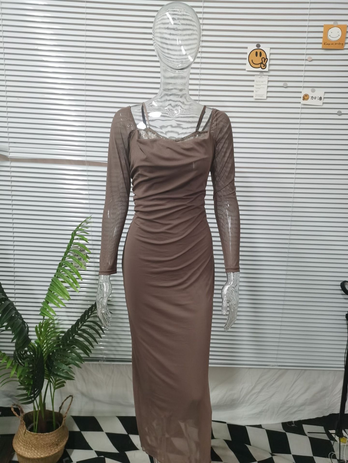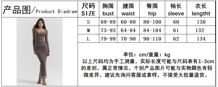 재고 유럽과 미국의 여성 의류 2025 봄과 여름 긴 소매 메쉬 패션 기질 하이 엔드 슬림 스플릿 긴 원피스
