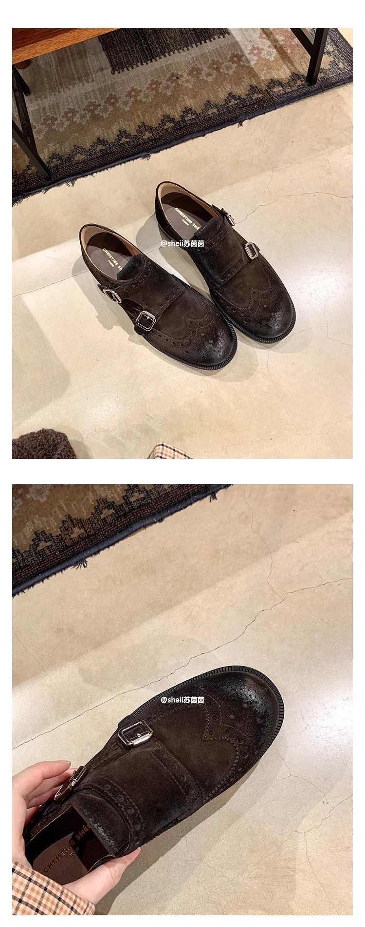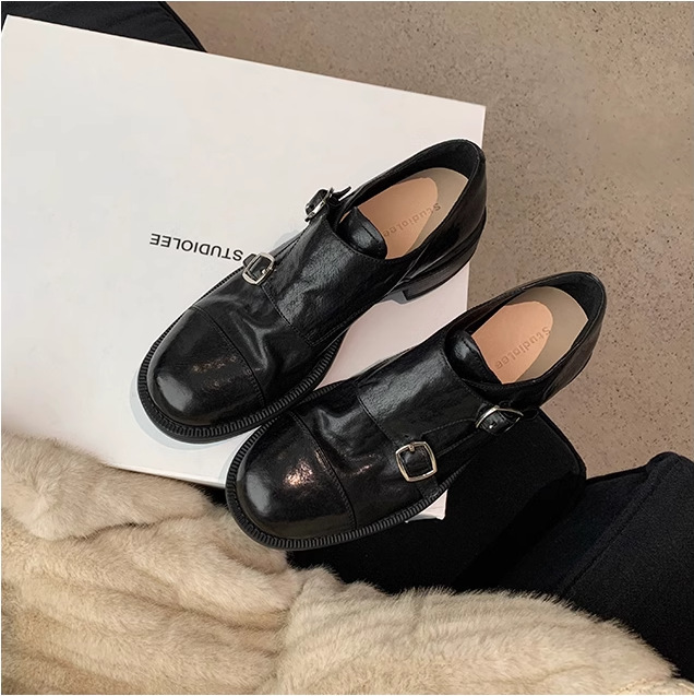 포도 엄마 같은 수축 말 가죽 더블 버클 라운드 머리 두꺼운 힐 높이 증가 모든 경기 영국 스타일 가죽 신발 여성 로퍼 겨울