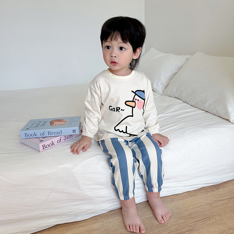 어린이 잠옷 소녀 풀오버 칼라 긴 소매 바지 홈 옷 세트 면 2024 봄 새 스타일 소년 소녀