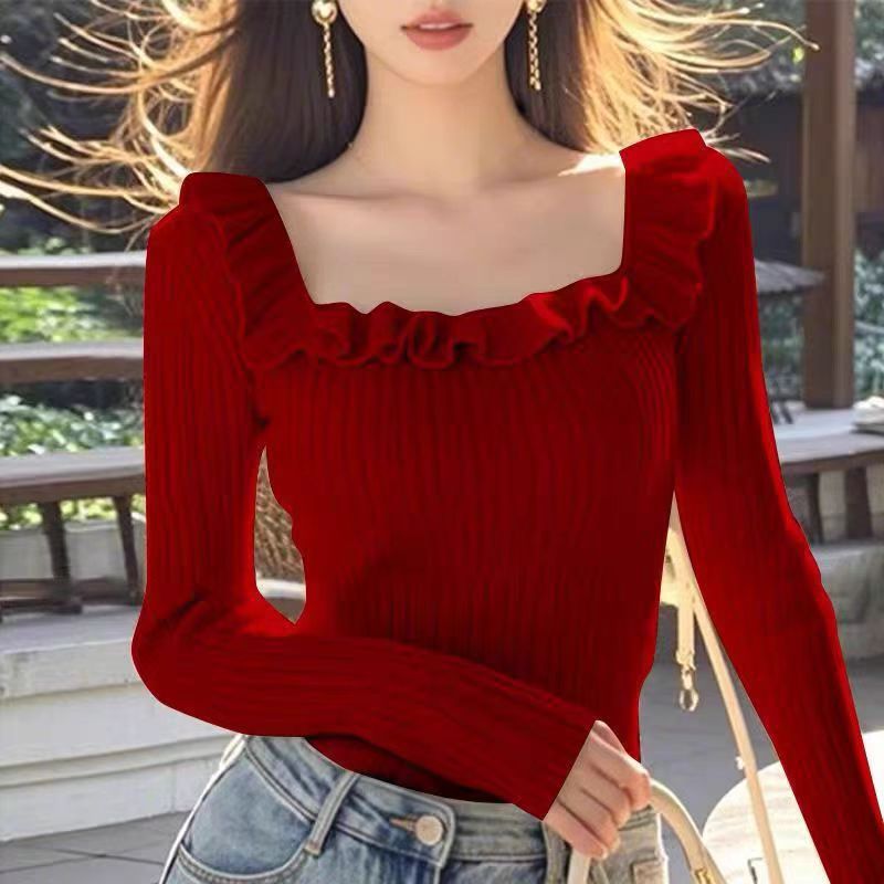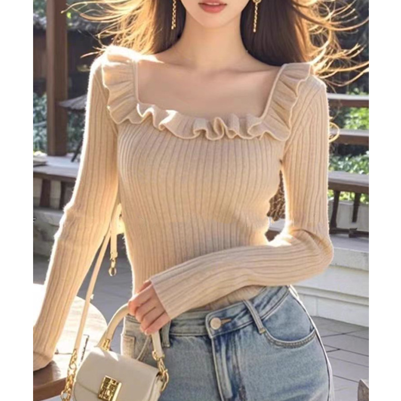 한국 스타일 착용 독특한 세련된 작은 탑 살구색 러플 니트 베이스 셔츠 가을 여성복 2025 새로운