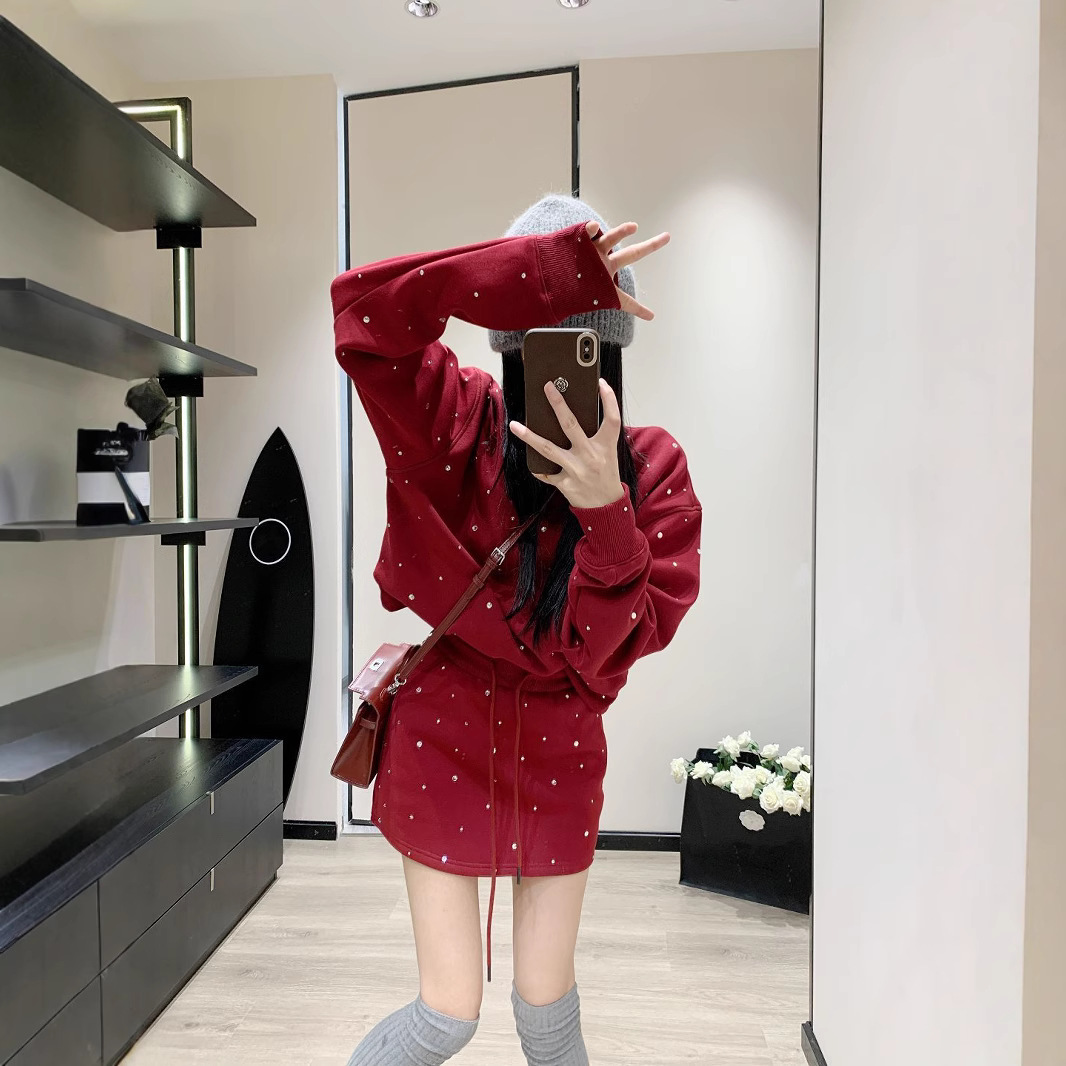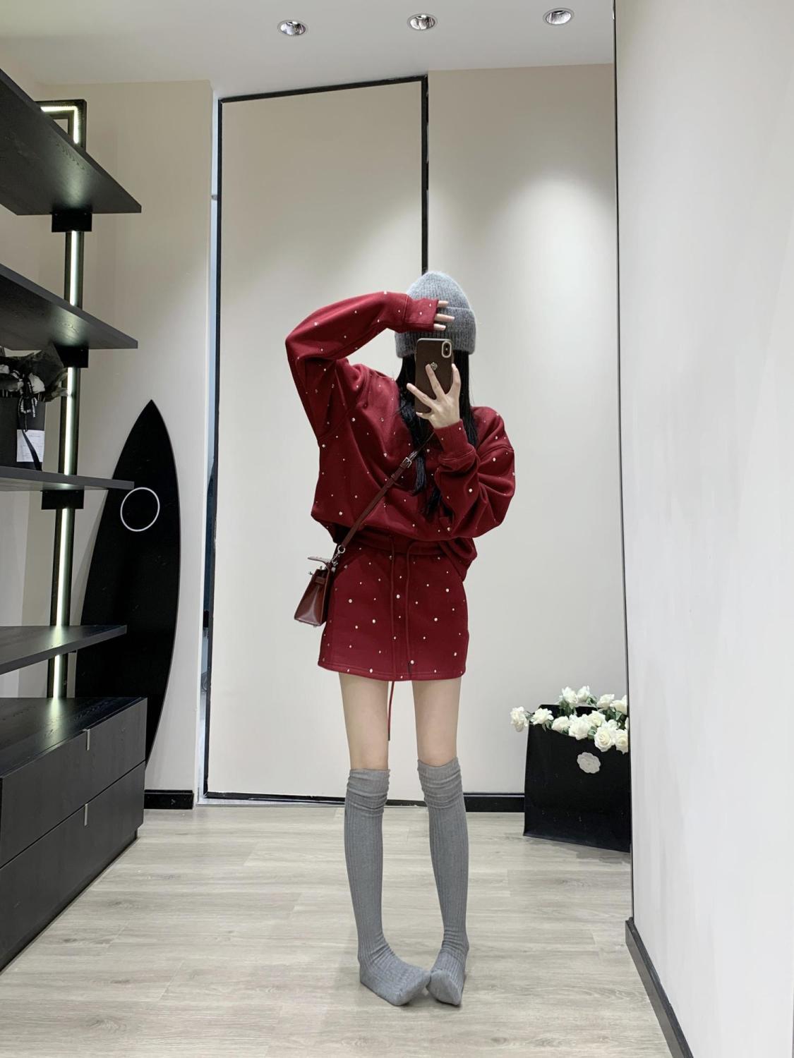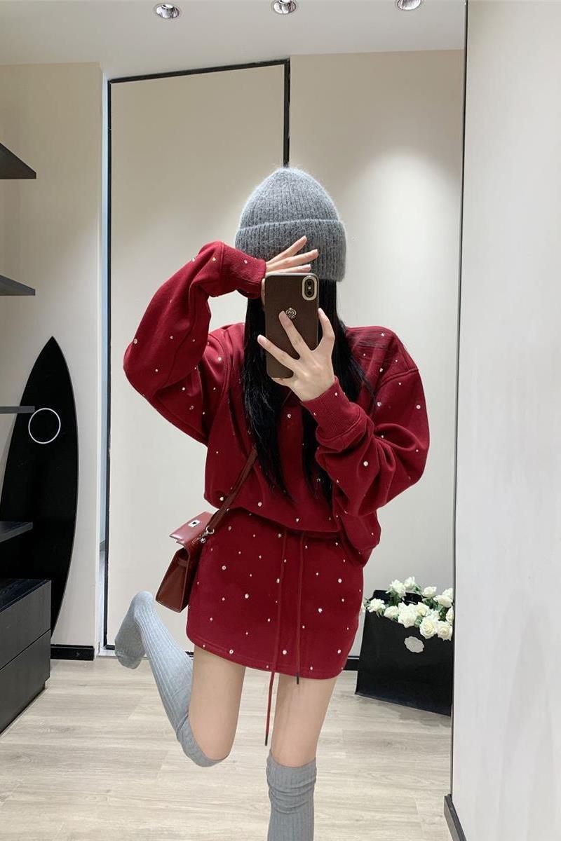 한국 스타일의 기질 하이 엔드 센스 핫 드릴링 긴팔 스웨트 셔츠 통근 하이 허리 슬림 룩 슬림 스커트 세트 여성의 봄과 가을스토어 가기