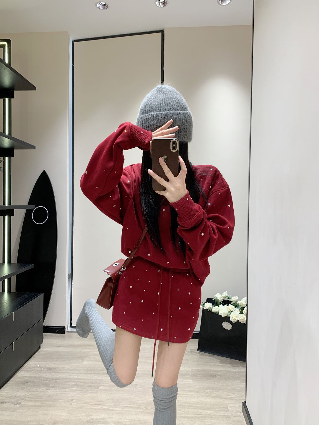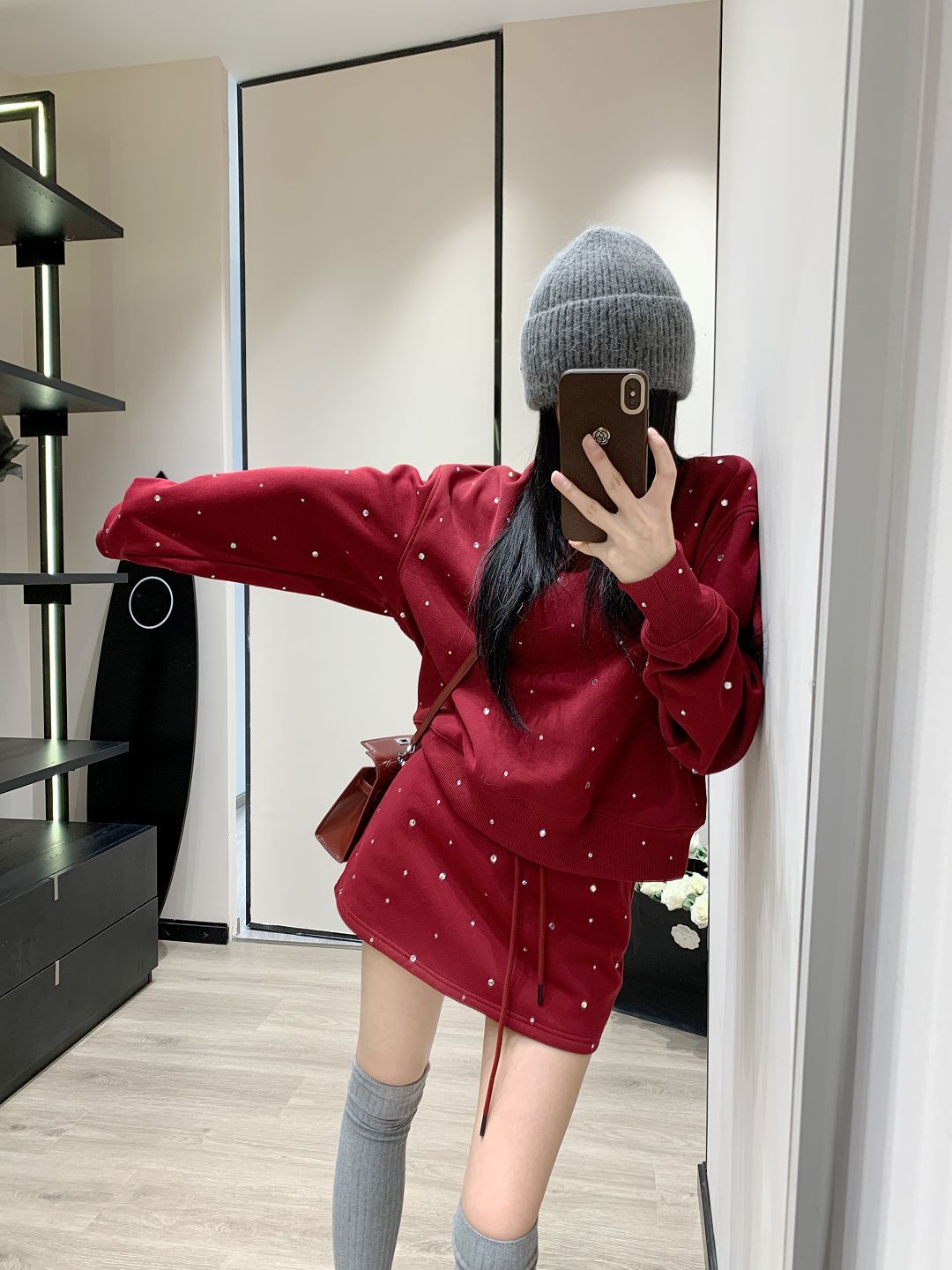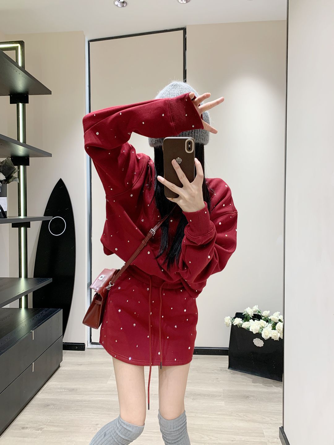 한국 스타일의 기질 하이 엔드 센스 핫 드릴링 긴팔 스웨트 셔츠 통근 하이 허리 슬림 룩 슬림 스커트 세트 여성의 봄과 가을스토어 가기