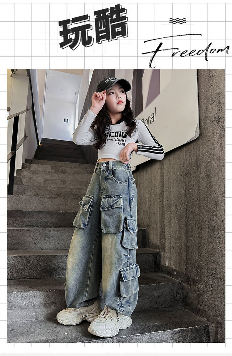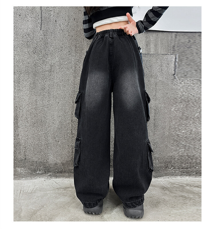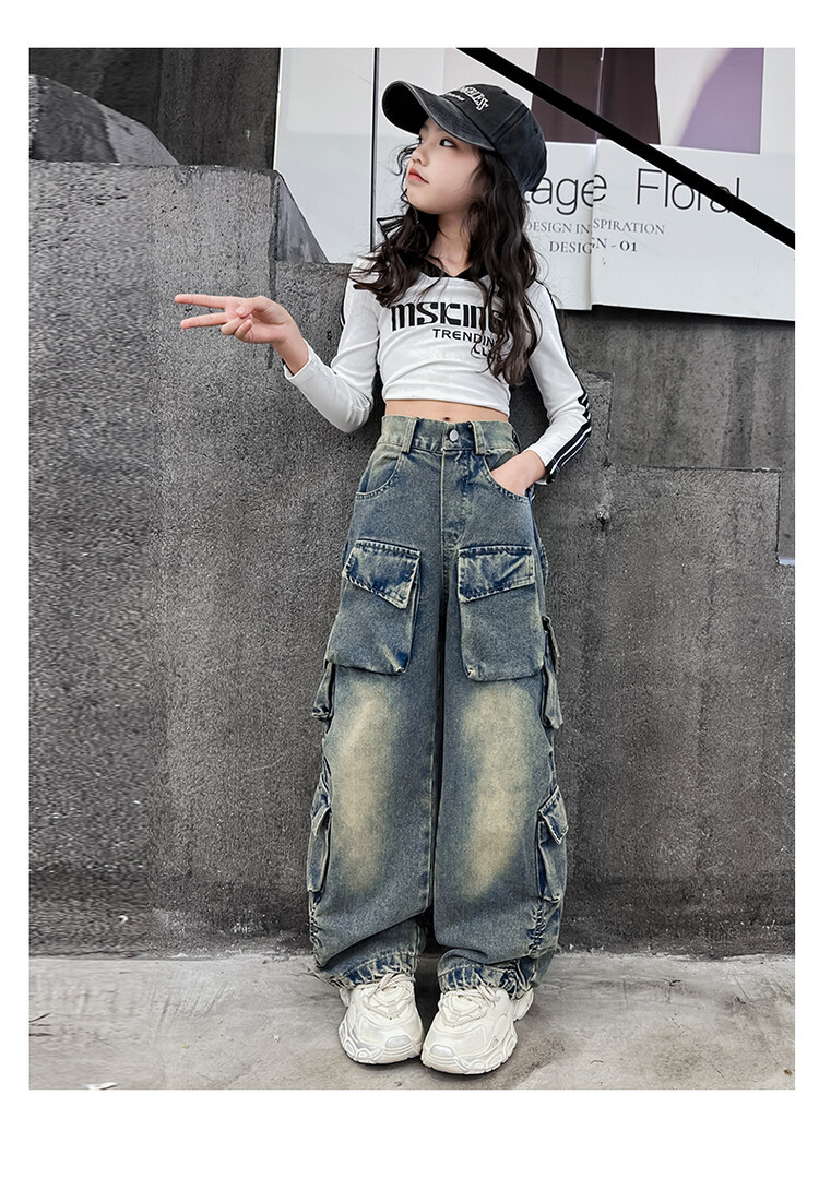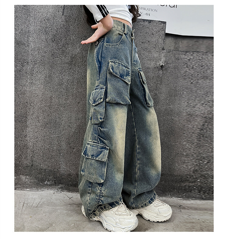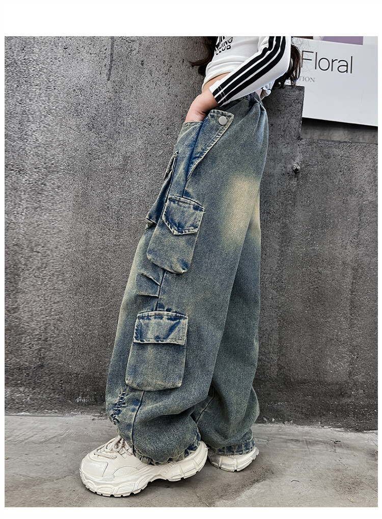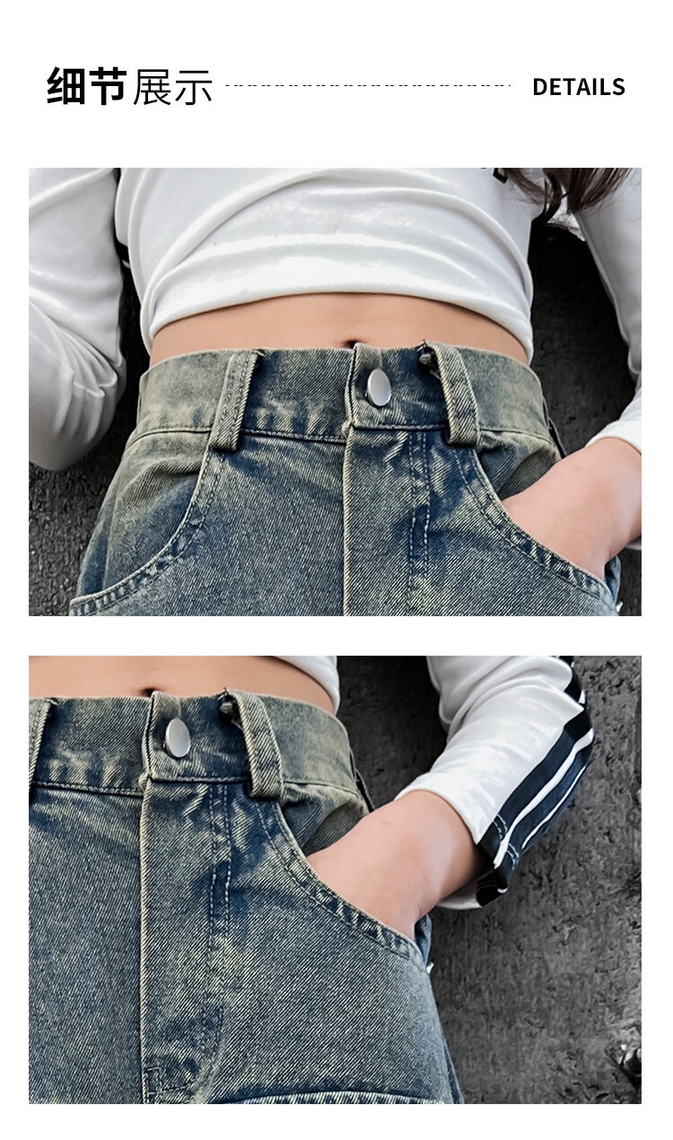 소녀들의 데님 봄과 가을 2025 년 새로운 큐크 어린이 외국 스타일의 봄 소녀 유행 스트레이트 레그 와이드 레그 팬츠스토어 가기