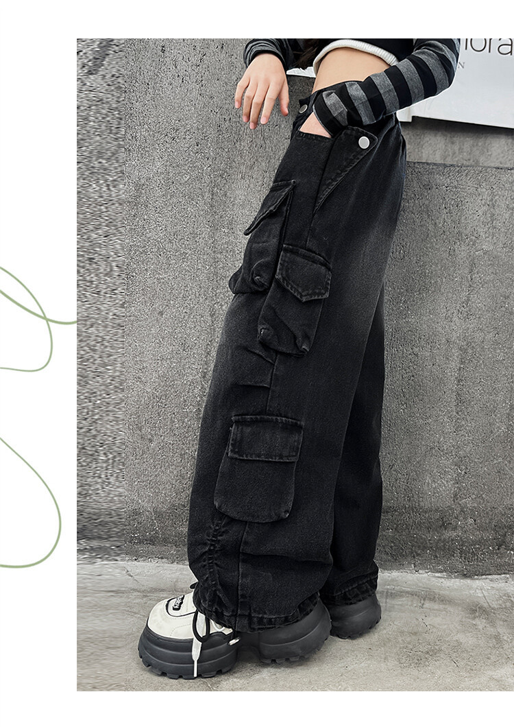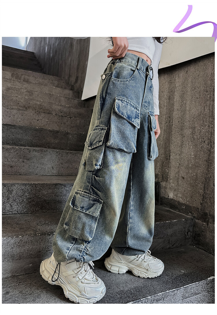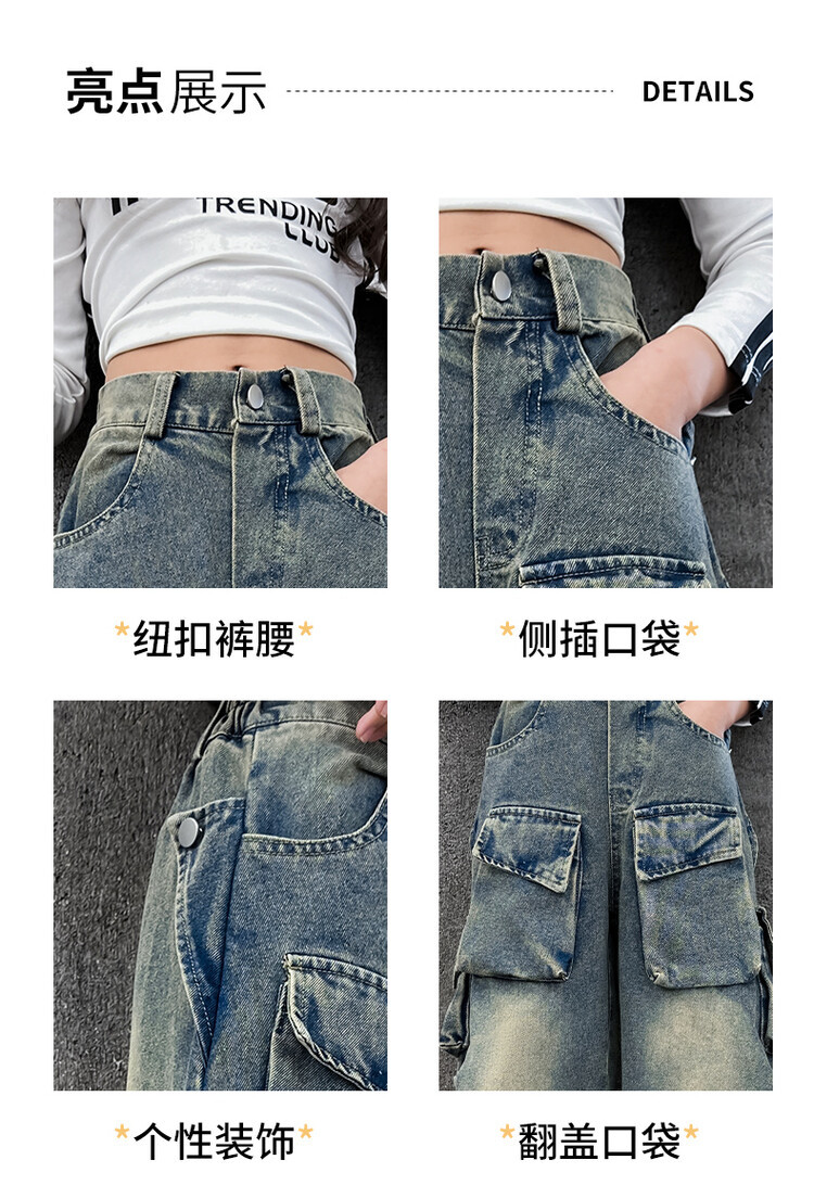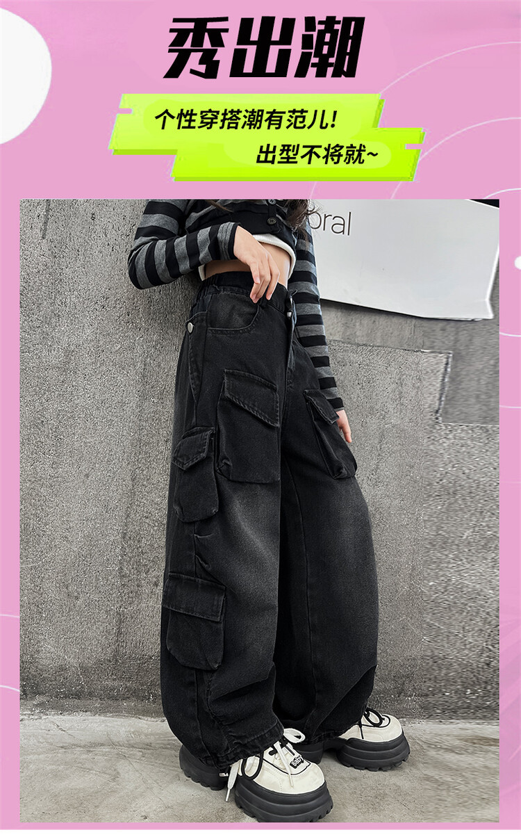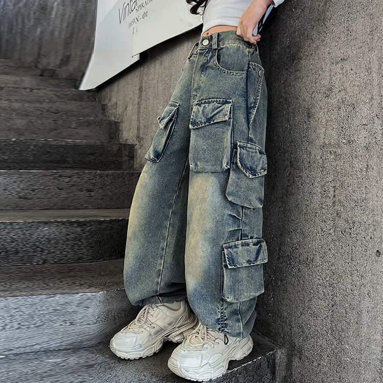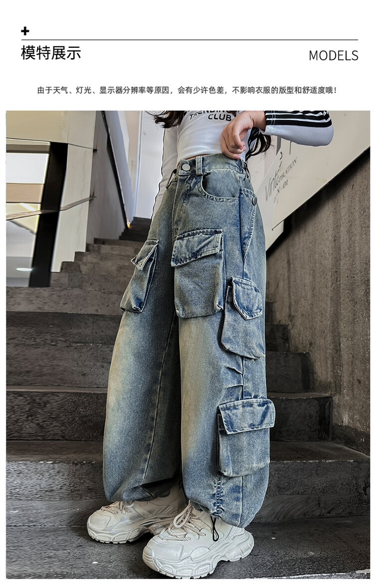 소녀들의 데님 봄과 가을 2025 년 새로운 큐크 어린이 외국 스타일의 봄 소녀 유행 스트레이트 레그 와이드 레그 팬츠스토어 가기