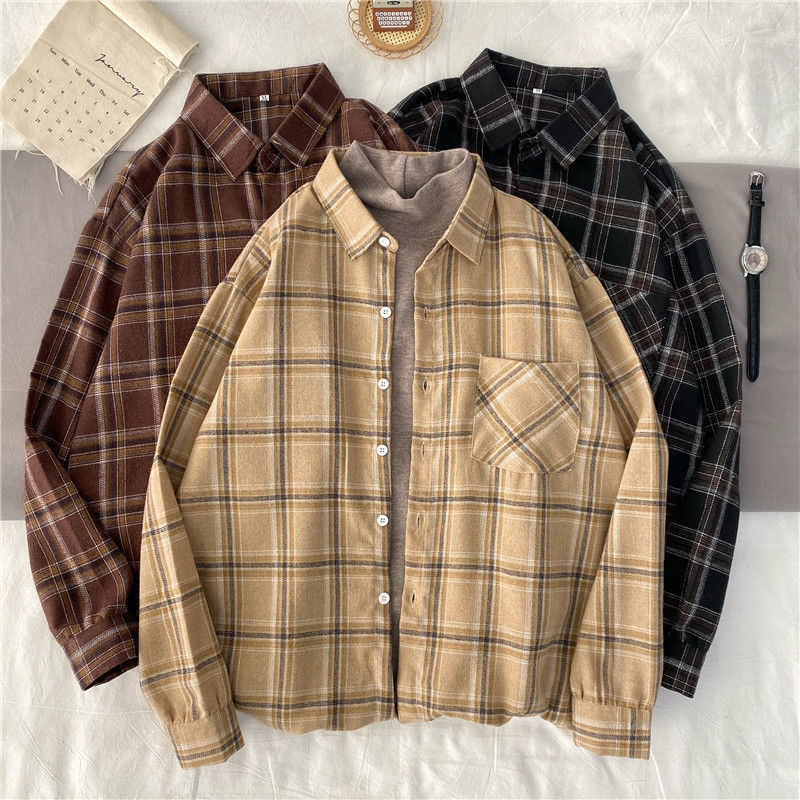 가을과 겨울 빈티지 긴팔 체크 셔츠 플러스 사이즈 여성 디자인 감각 느슨한 올매치 탑 통비 자매 셔츠 재킷스토어 가기