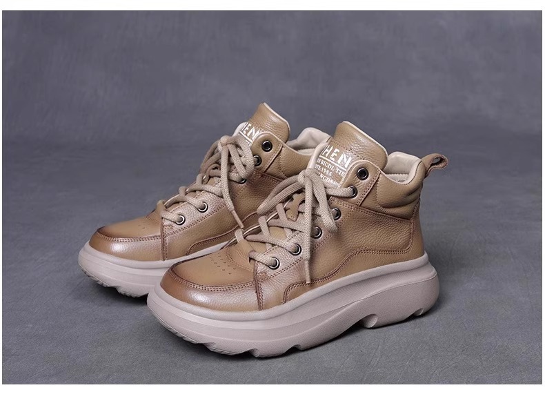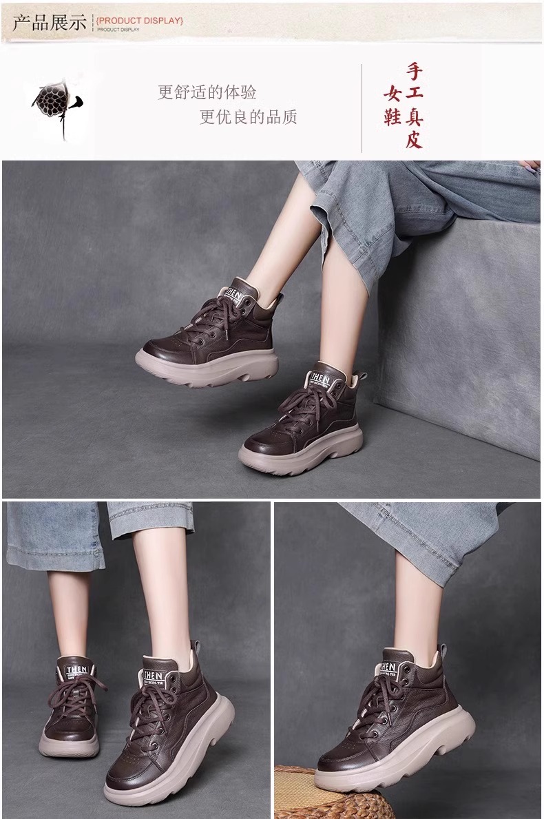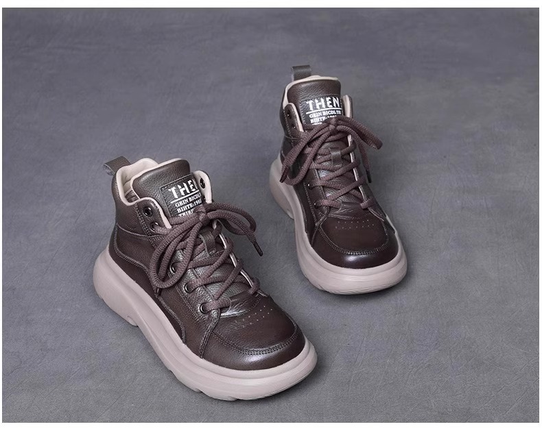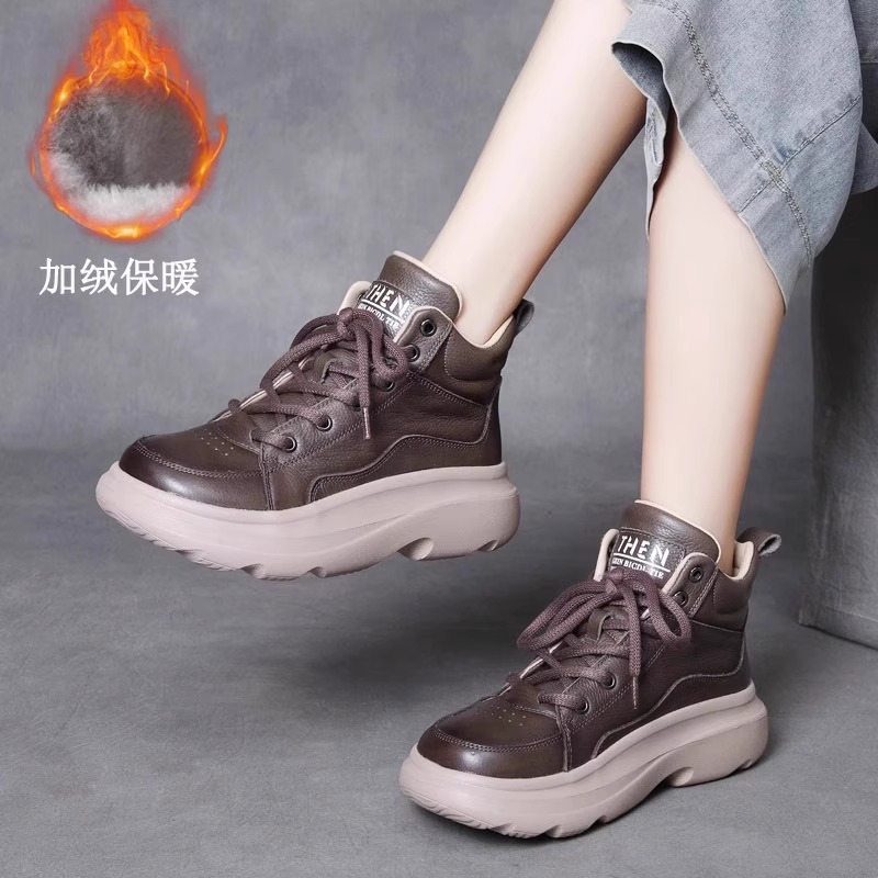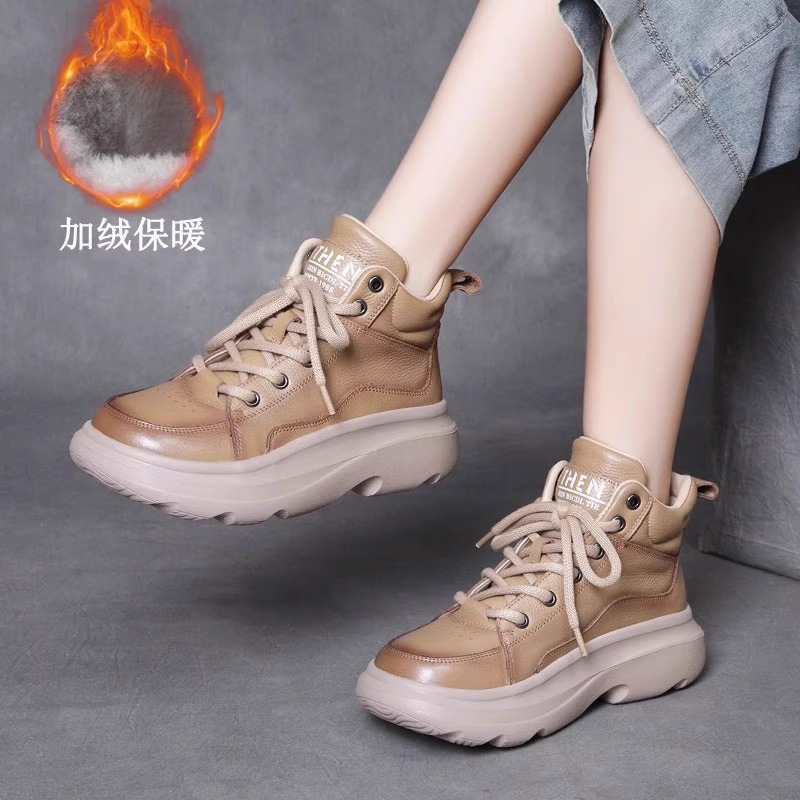여성용 신발 2025 봄 가을 신상 천연 가죽 레트로 스타일 다용도 플러스 벨벳 보온 하이탑 캐주얼 신발 두꺼운 밑창 다용도 여성 신발