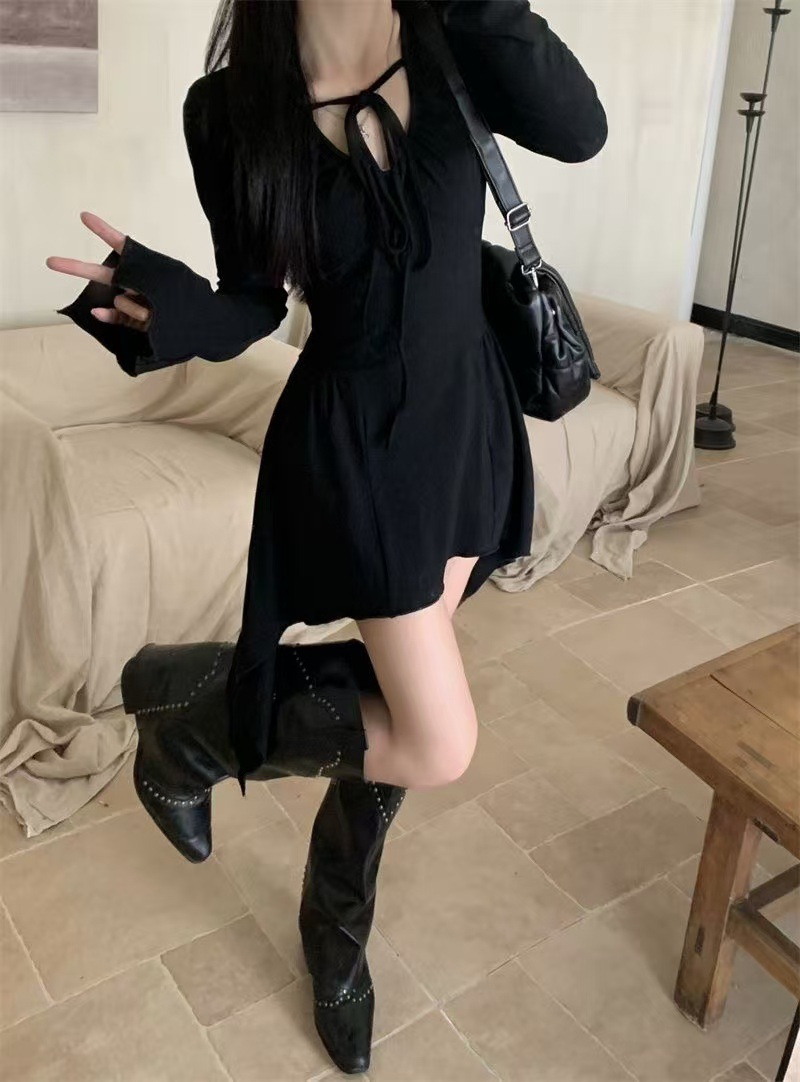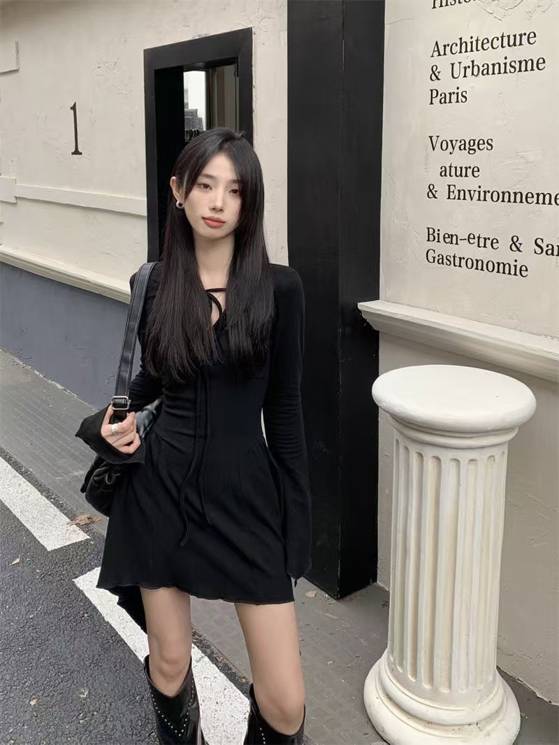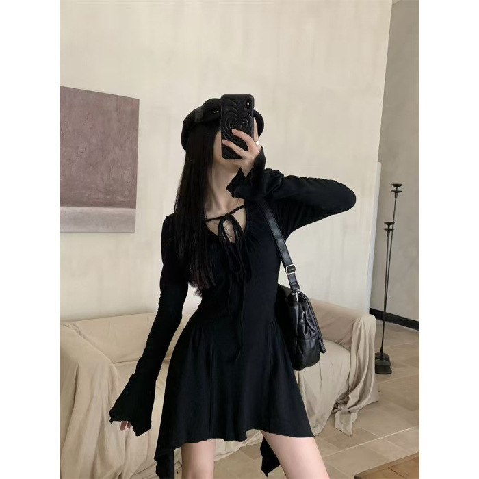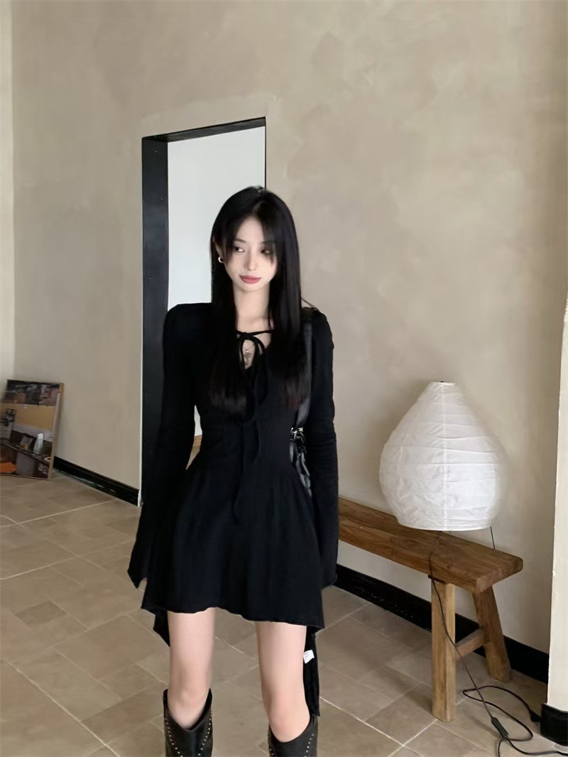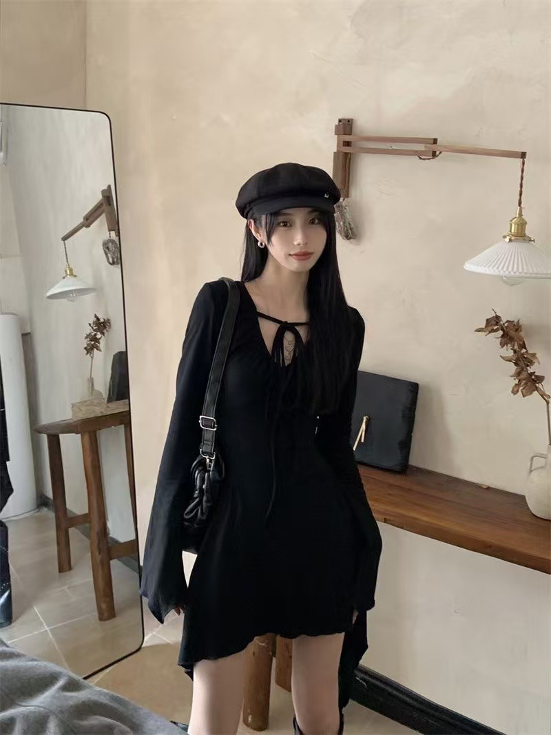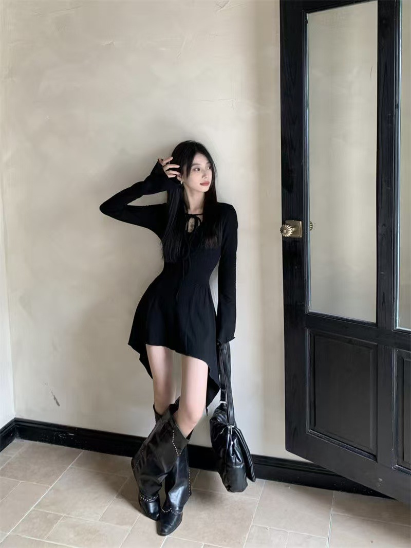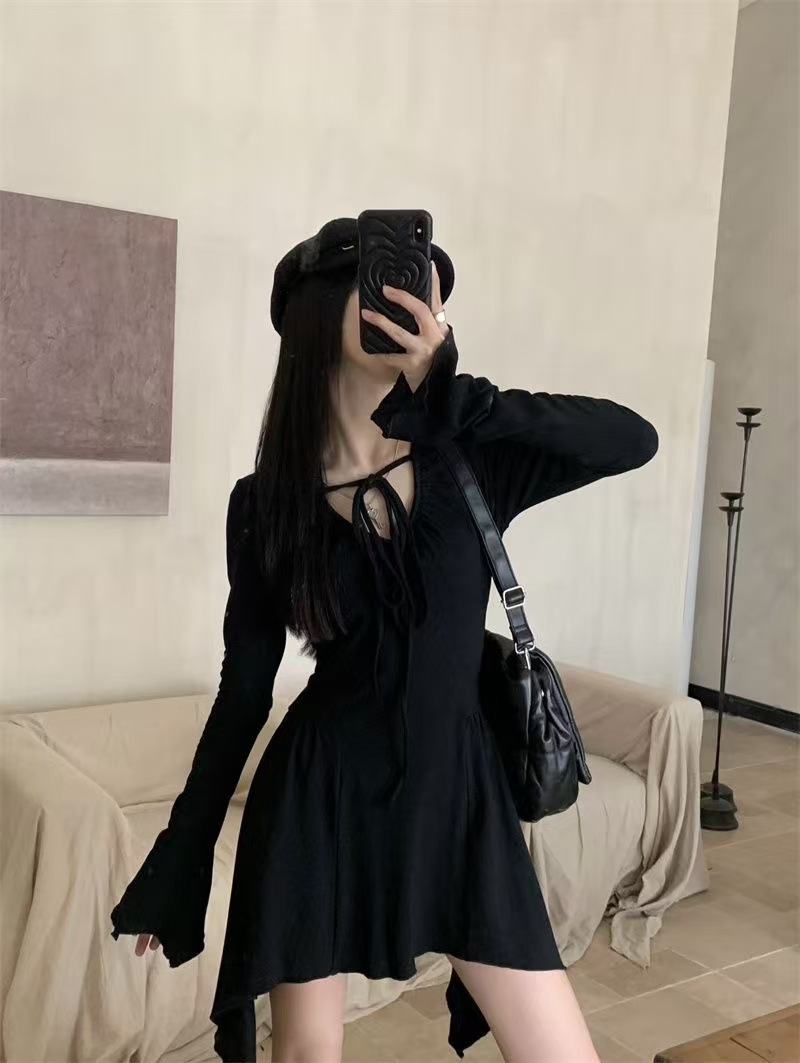 순수한 우아한 스파이스 소녀 불규칙한 긴 소매 타이트 허리 원피스 슬리밍 트럼펫 소매 엉덩이 스커트베이스 스커트