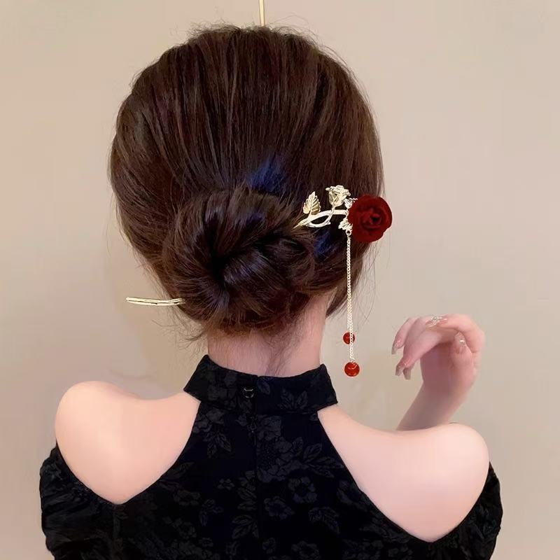 새해 골동품 빨간 장미 머리띠 여성용 머리 디스크 머리 머리 머리 머리 머리 술 한푸 청삼 우아한 고급 헤드웨어