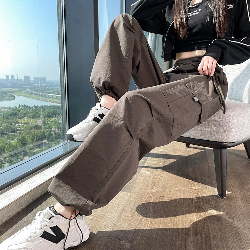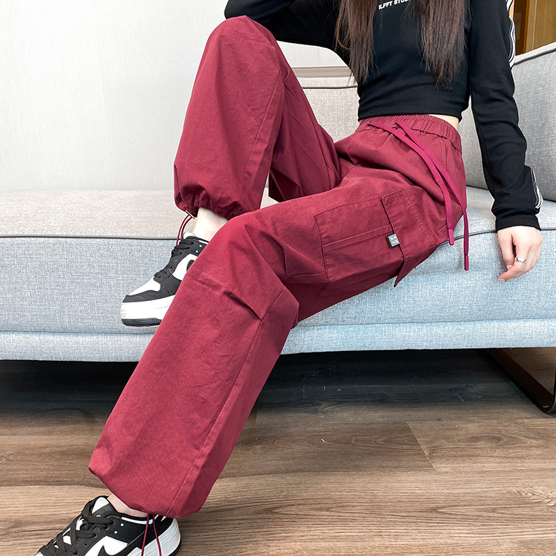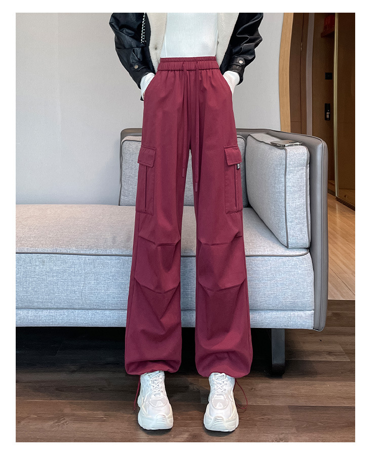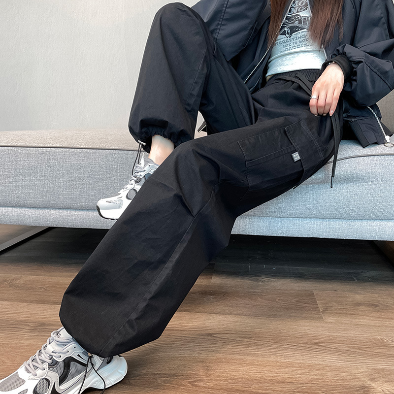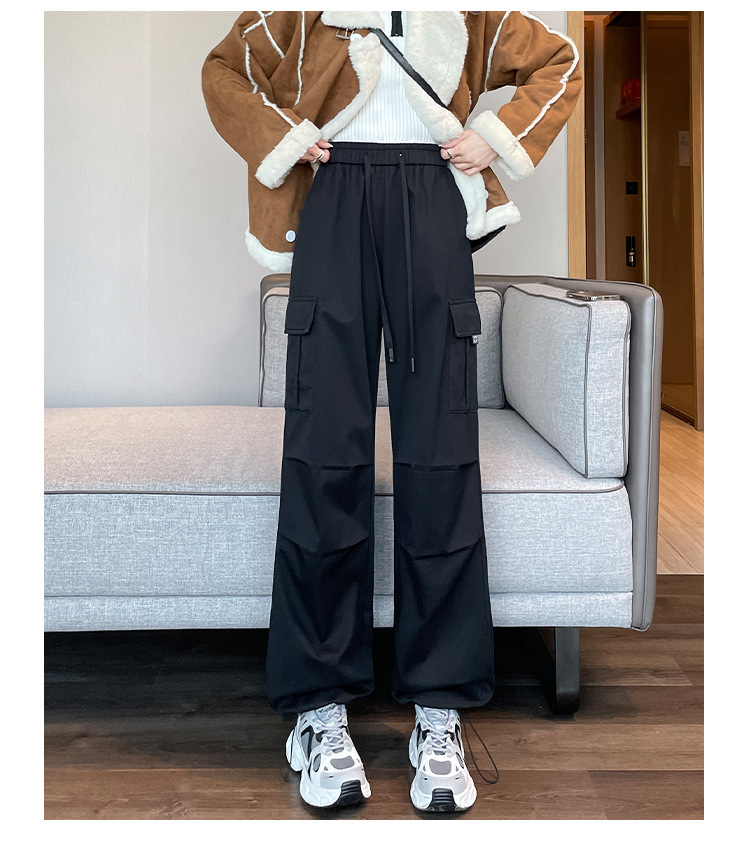 검은 기모 크록 바지 여성 가을과 겨울 미국 스타일의 높은 허리 느슨한 넓은 다리 작은 등반 방풍 스포츠 바지