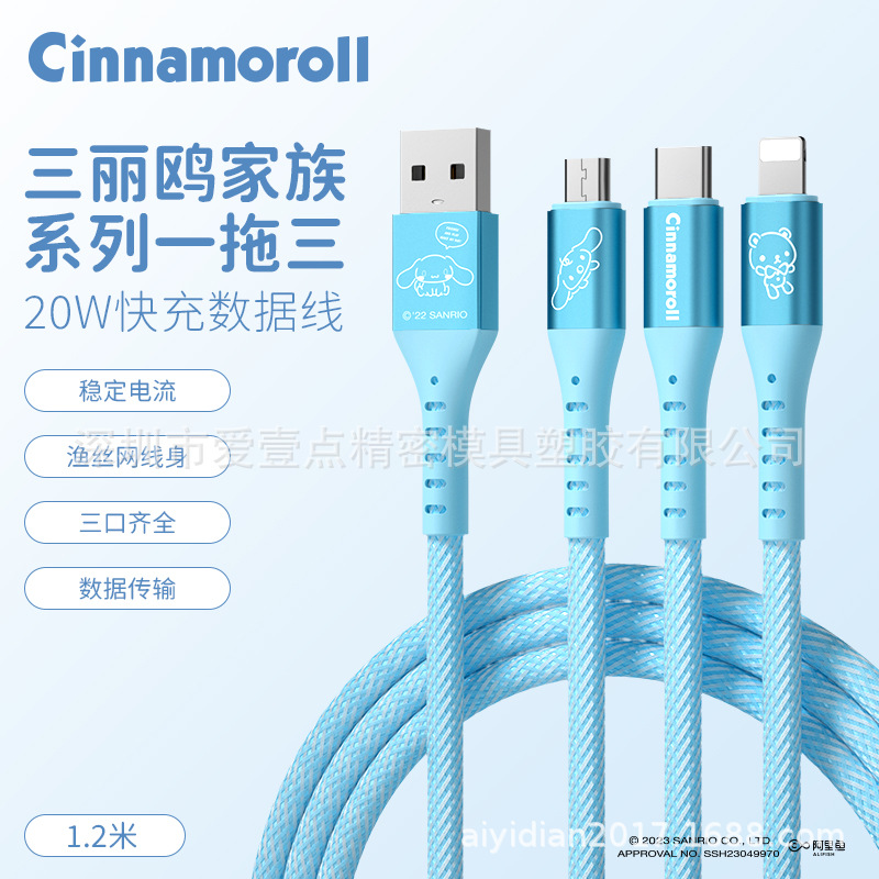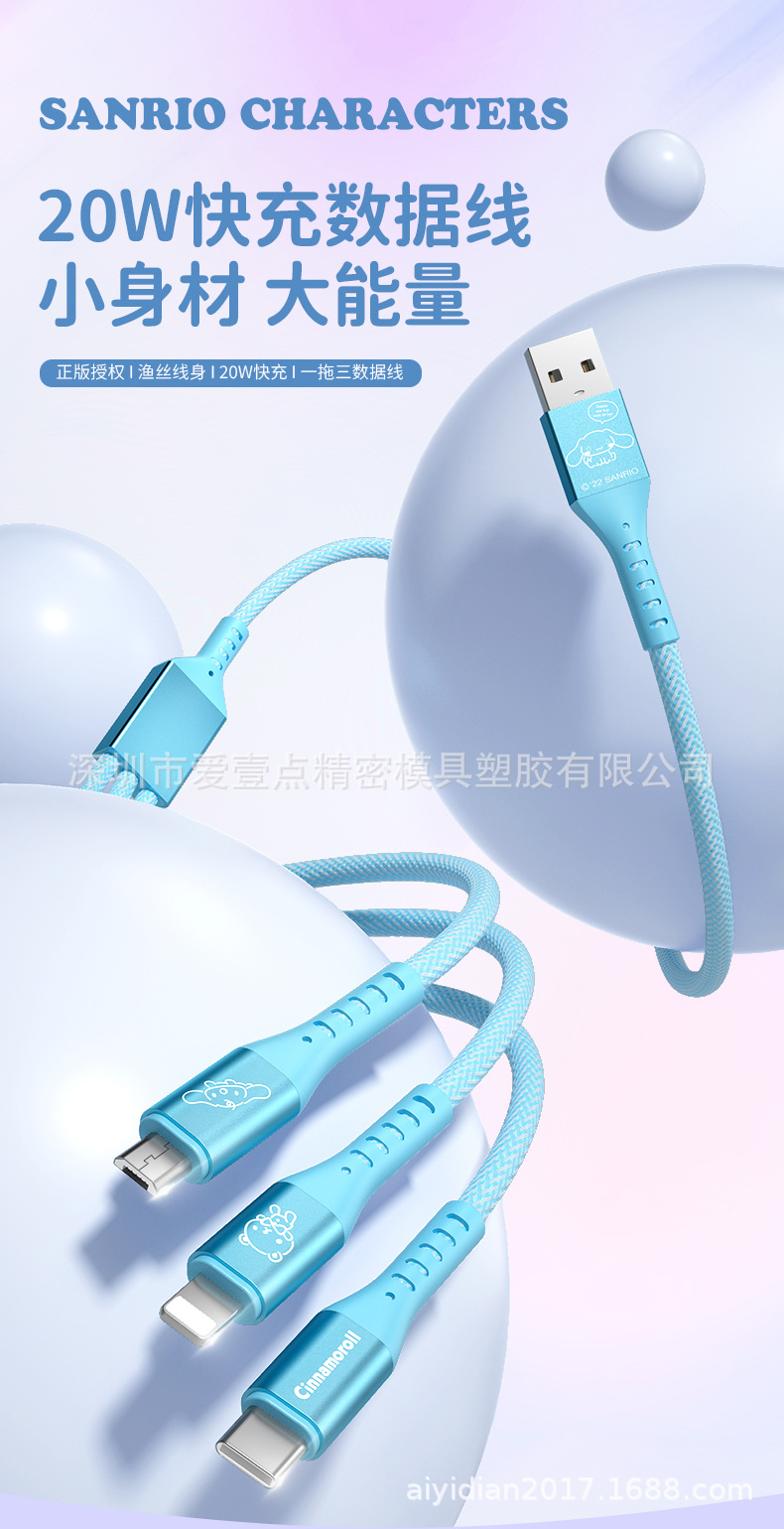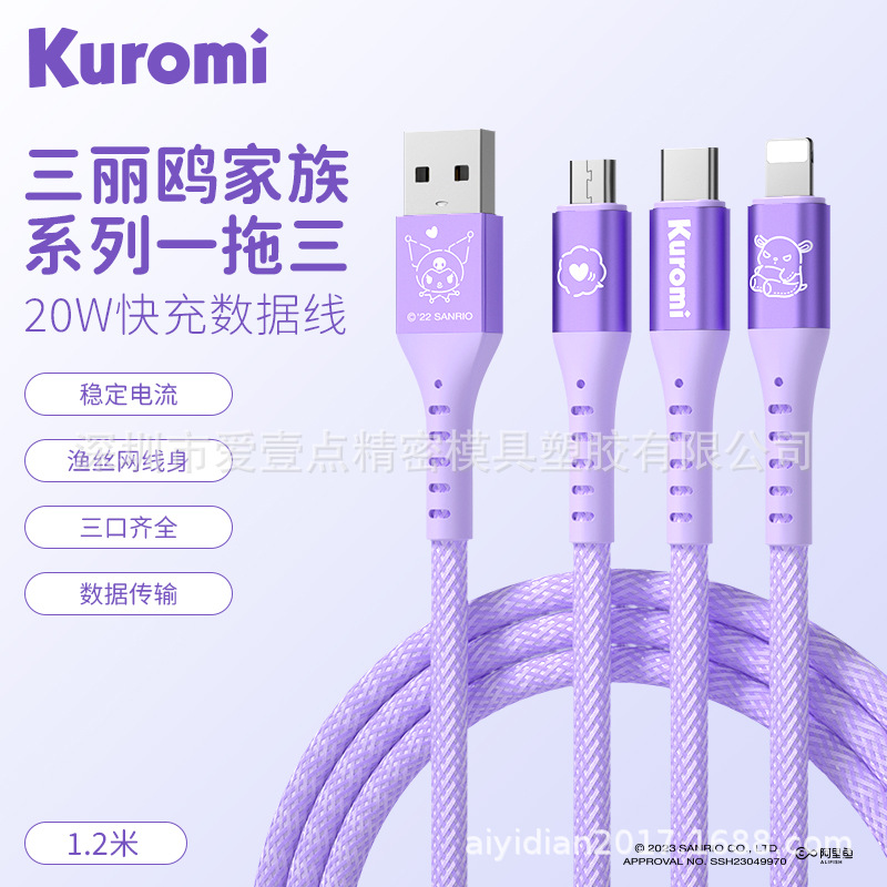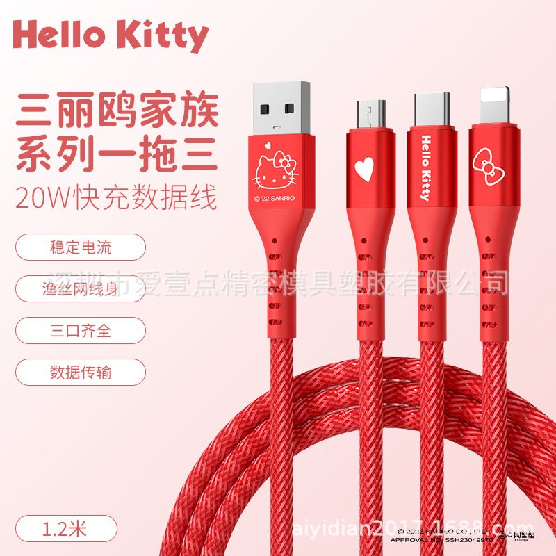 헬로 키티 원 드래그 세 데이터 라인 헬로 키티 빠른 충전 애플 15 시리즈 화웨이 20W 세 머리