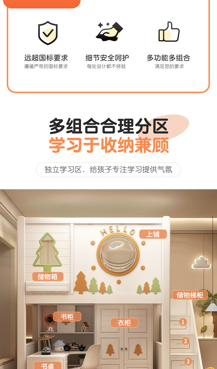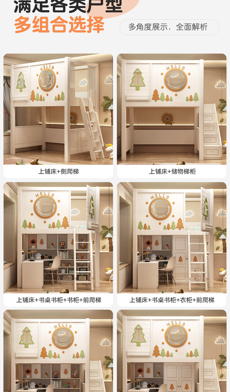• 조합 29: 상단 침대 + 책장 책상 + 옷장 + 푸시풀 옷장 + 사다리 캐비닛(매트리스 + 상단 커튼 포함)
