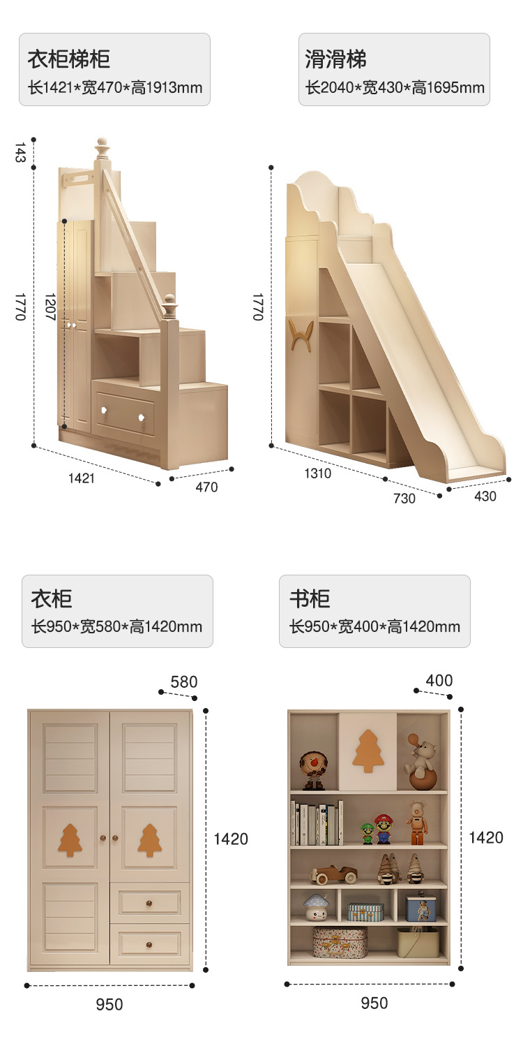 • 조합 24: 상단 침대 + 책장 + 옷장 + 슬라이드 + 사다리 캐비닛(매트리스 + 상단 커튼 포함)