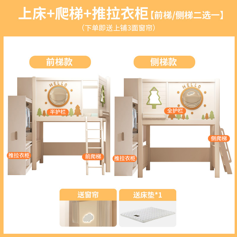 • 조합 3: 상부 침대 + 사다리 + 푸시풀 옷장 [앞사다리/사이드사다리 옵션] (매트리스 + 상부 침대 커튼 포함)