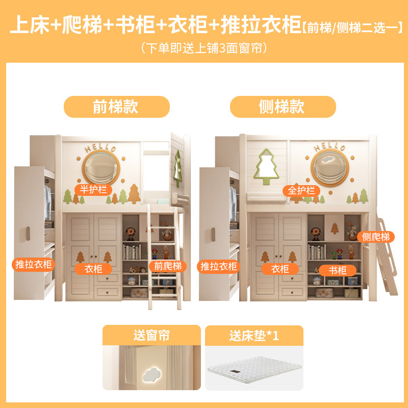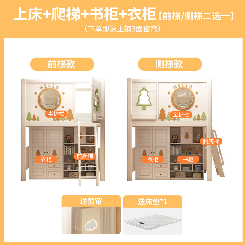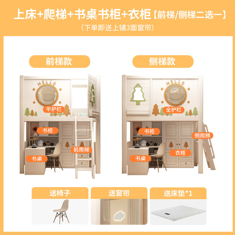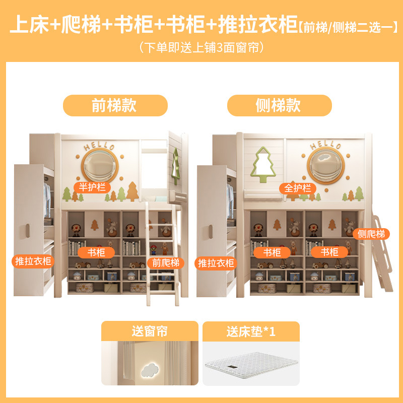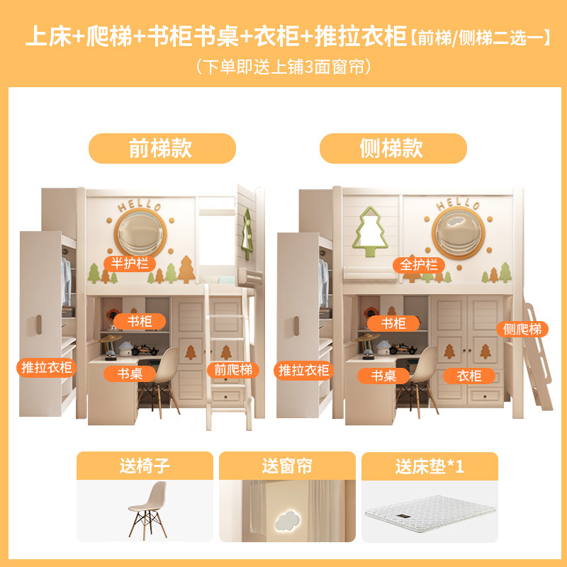 • 조합 9: 침대 위쪽 + 사다리 + 책장 책상 + 옷장 [전면 사다리/사이드 사다리 옵션] (매트리스 + 상단 커튼 포함)