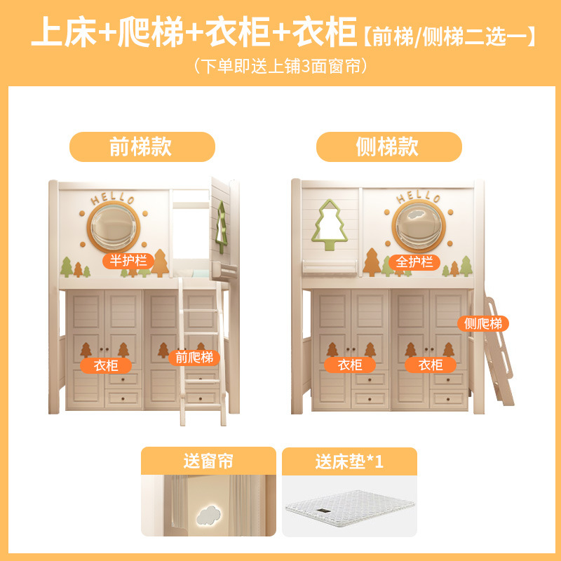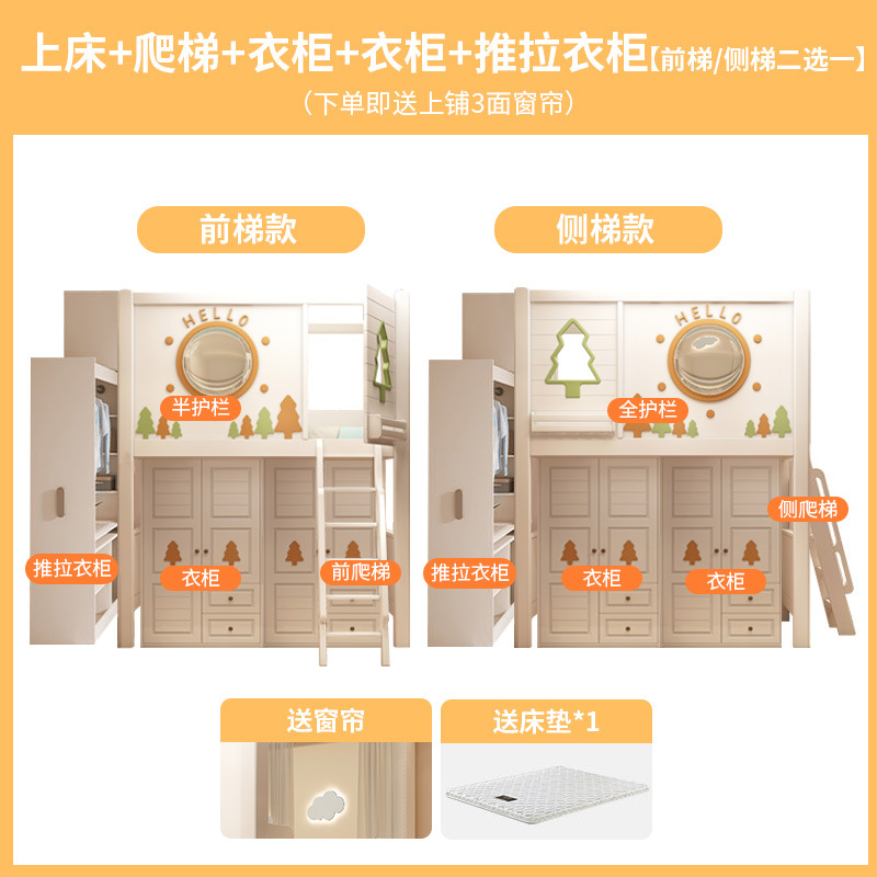 • 조합 19: 침대 위쪽 + 사다리 + 옷장 + 옷장 + 푸시풀 옷장 [전면 사다리/사이드 사다리 옵션] (매트리스 + 상단 커튼 포함)