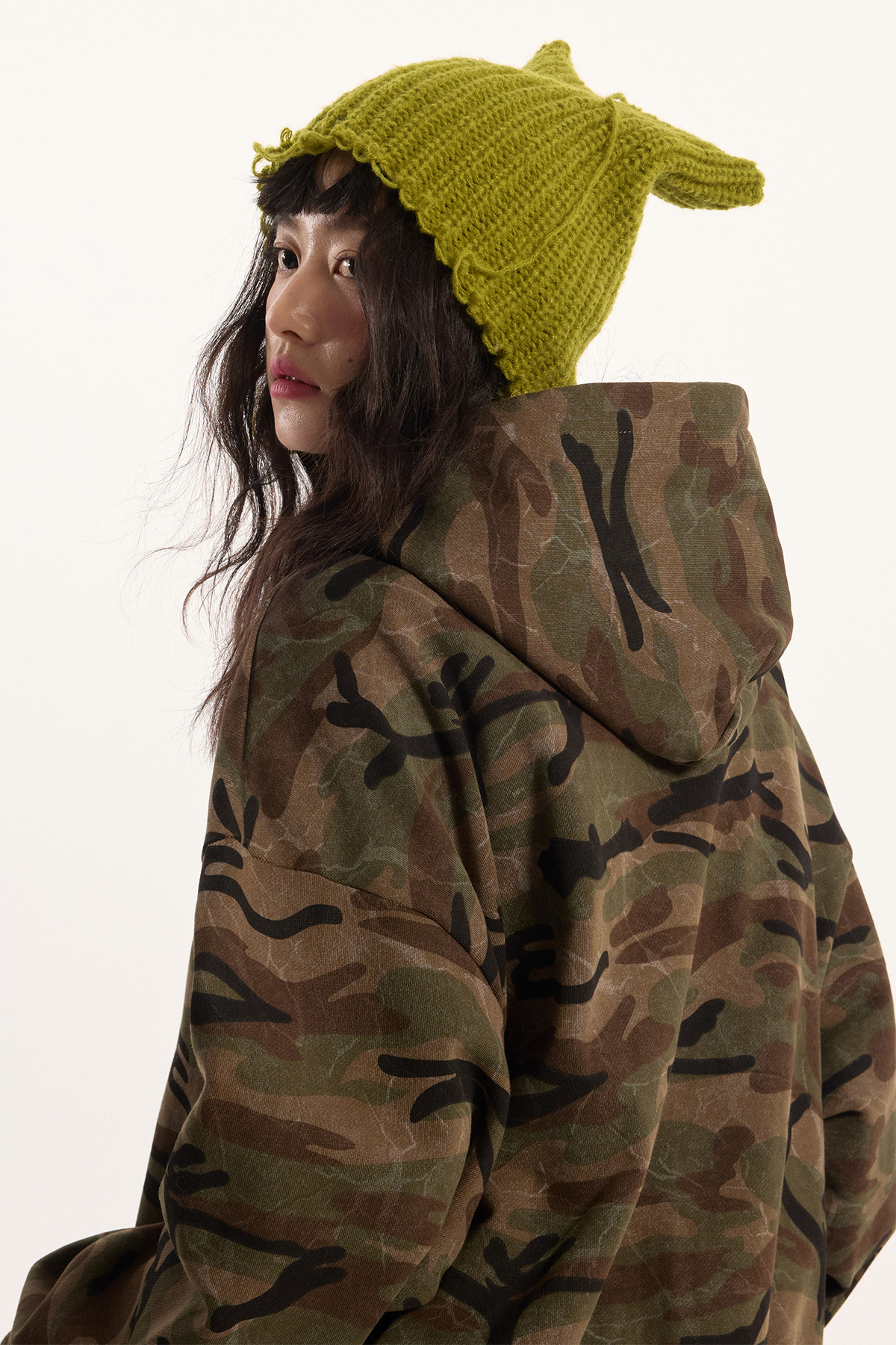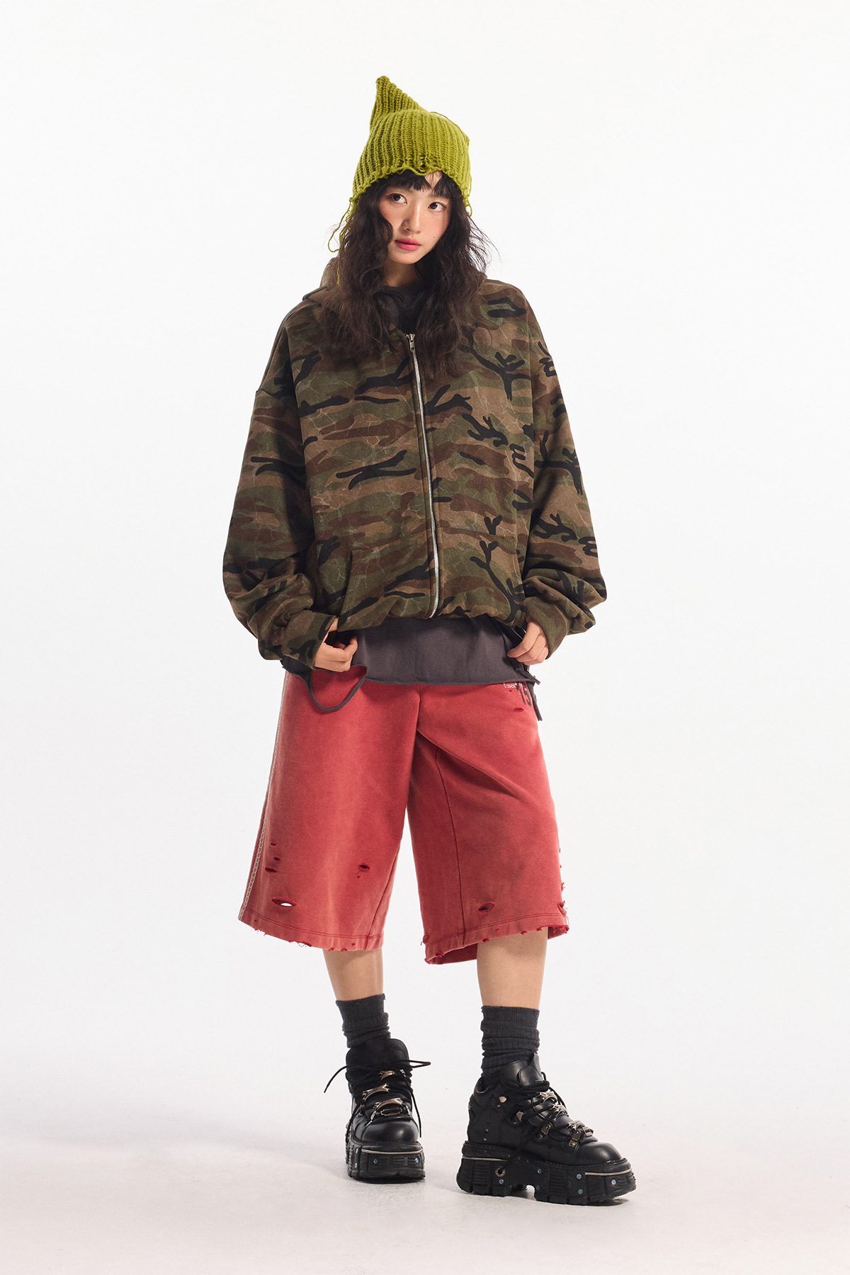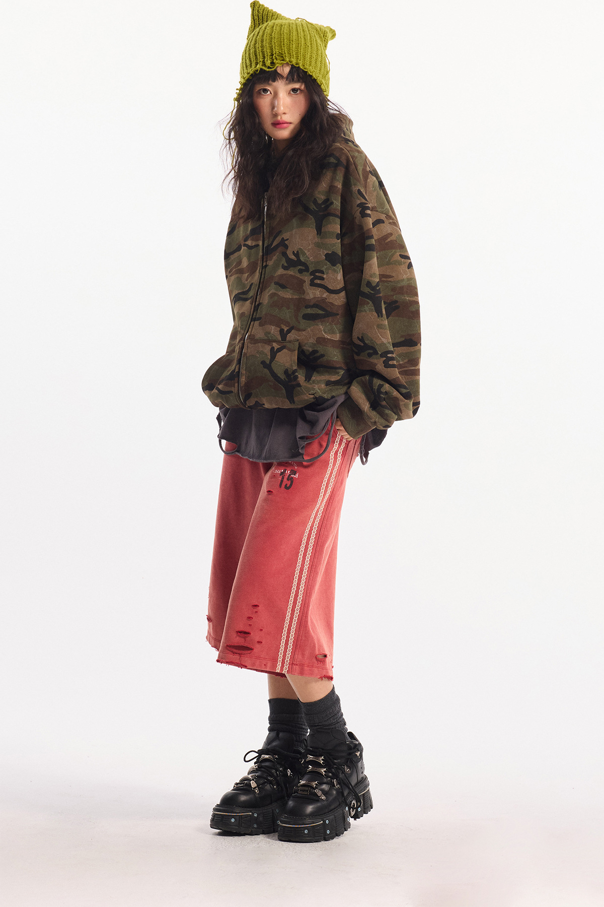 Jiayi 도서관 남자 2025 봄 새로운 미국 거리 위장 후드 재킷 커플 카디건 지퍼 스웨터스토어 가기