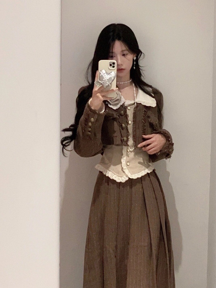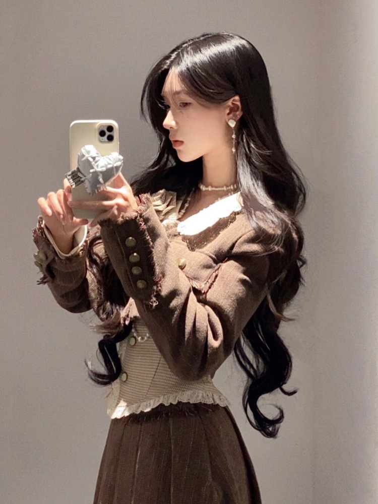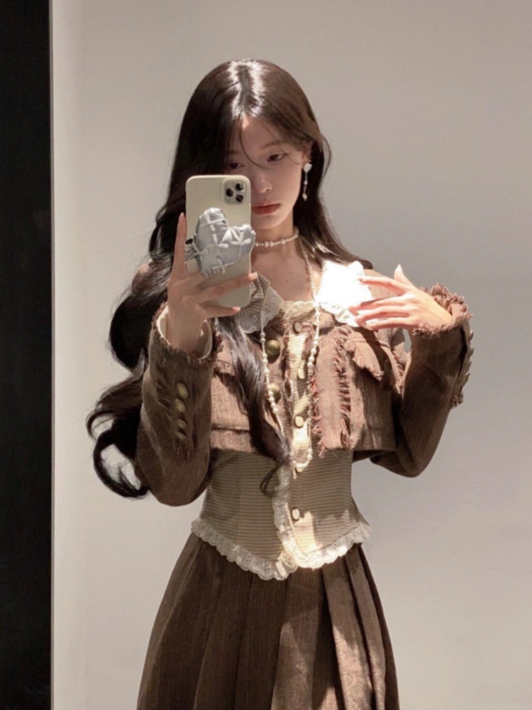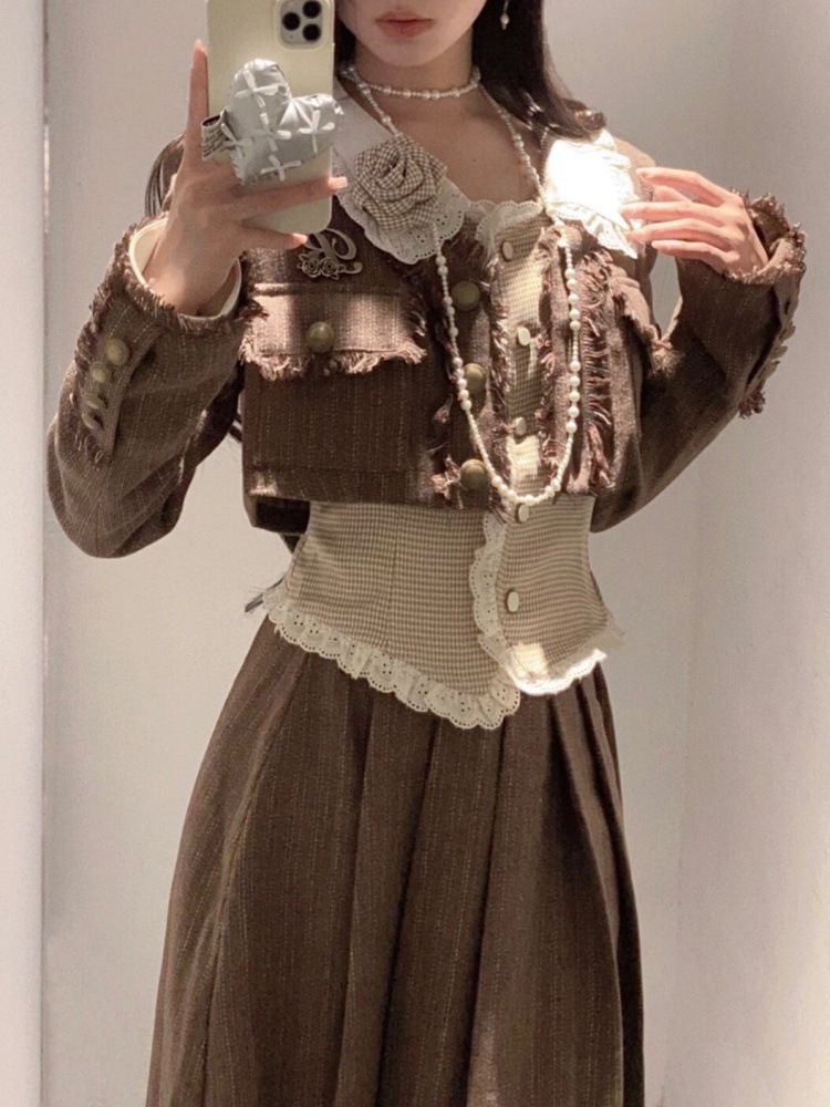 가을과 겨울 스타일 샤넬 스타일 유행 우아한 새로운 복고풍 스타일 짧은 재킷 슬리밍 셔츠 높은 허리 스커트 3 조각 세트스토어 가기