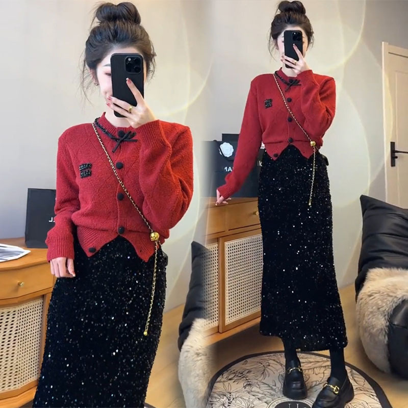 2024 가을과 겨울 새로운 빨간 카디건 스웨터 코트 여성의 반짝이는 스팽글 스커트 세트 기질 사교계 스타일