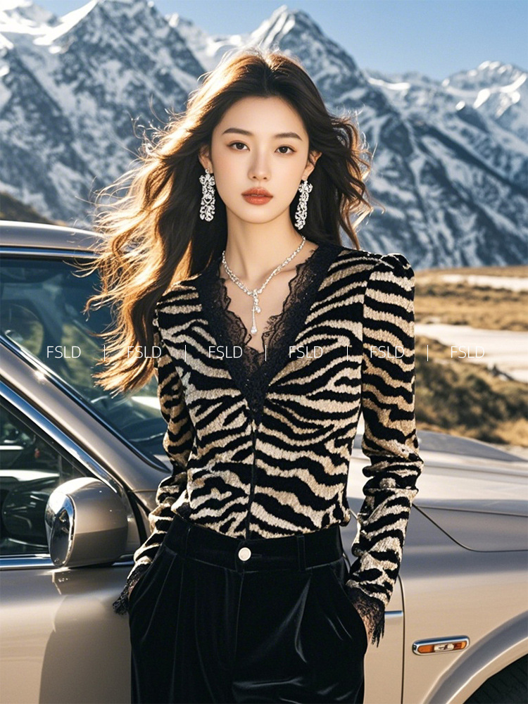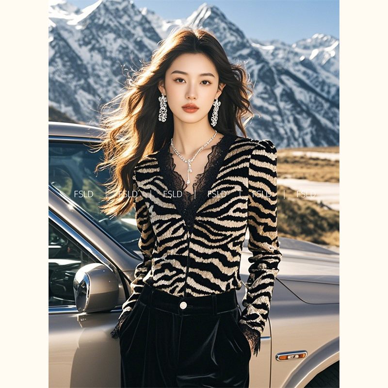 YT392893 올해 인기있는 독특한 아름다운 셔츠 얼룩말 레이스베이스 벨벳 셔츠 여성 2024스토어 가기