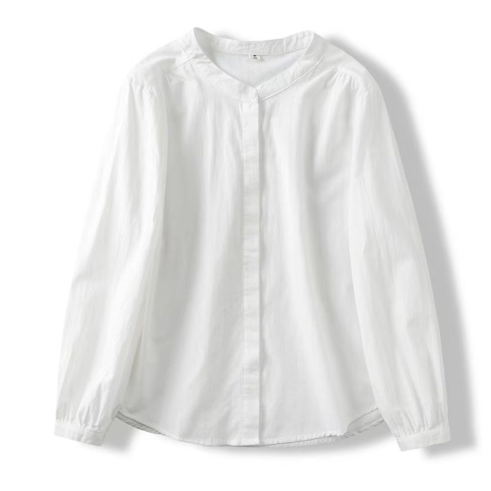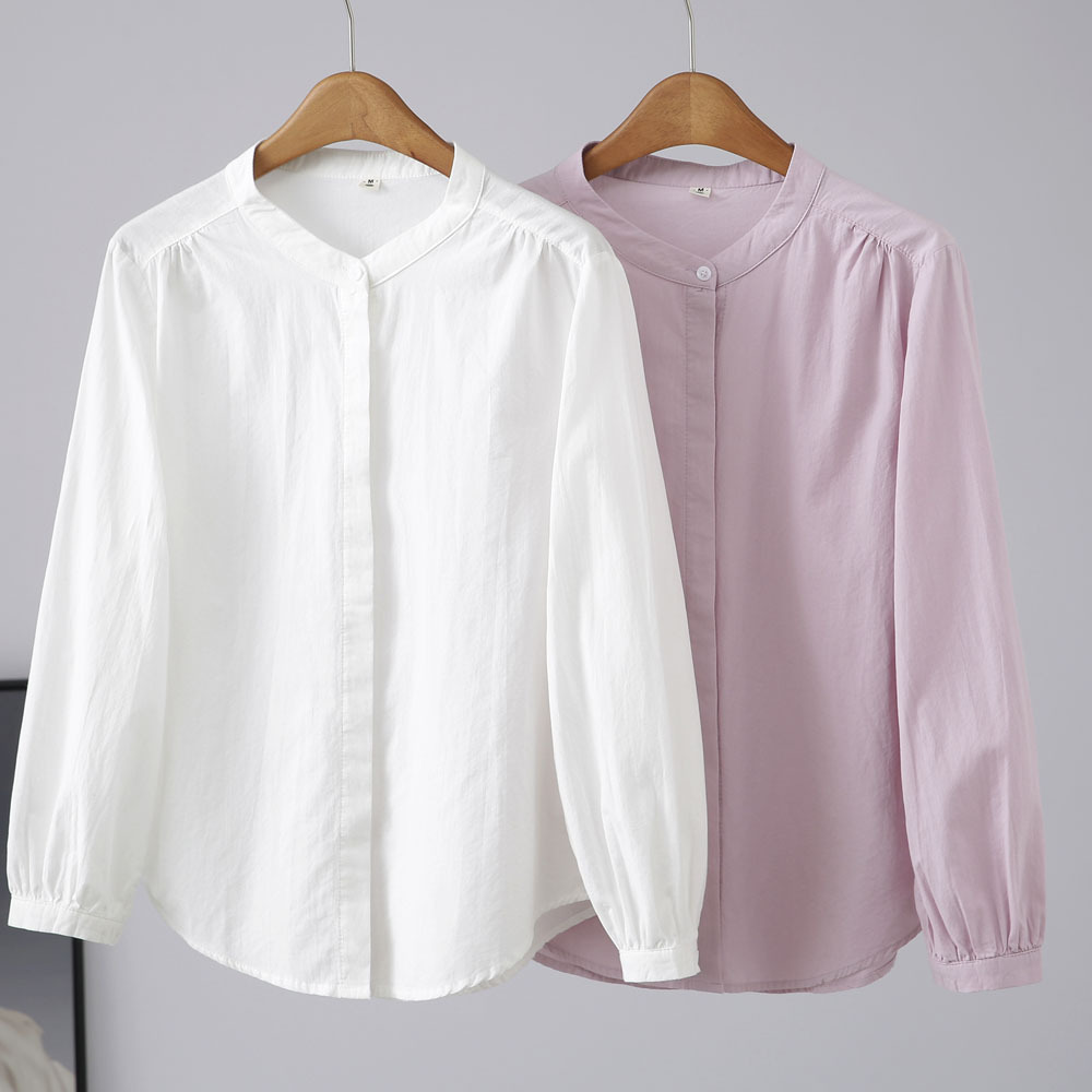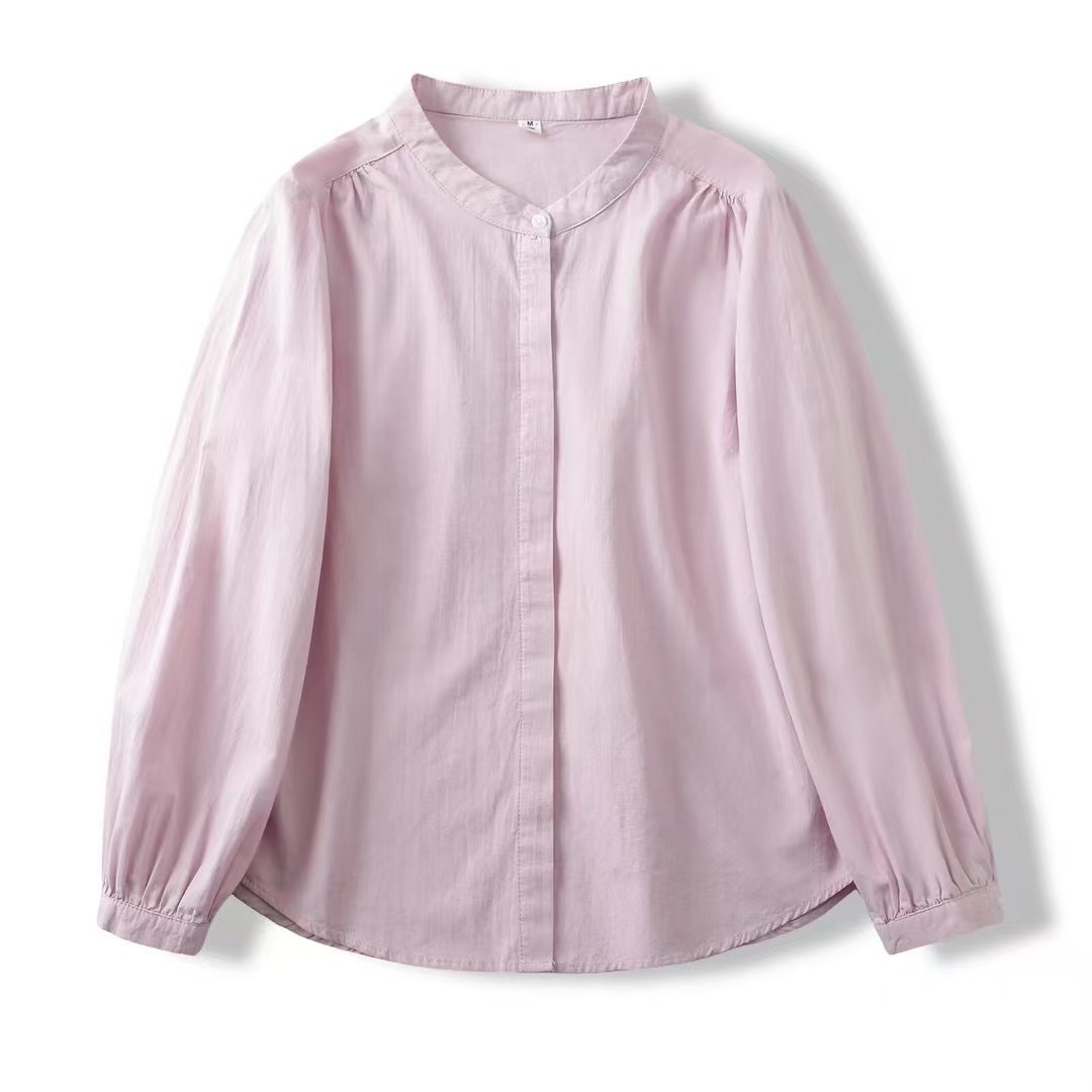 여성복 2025 봄 가을 신상 부드러운 이중 면사 스탠드 칼라 긴팔 셔츠 여성 상의