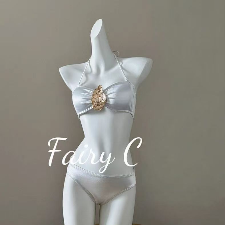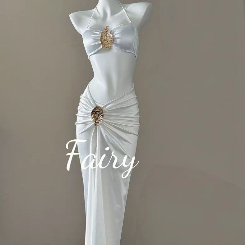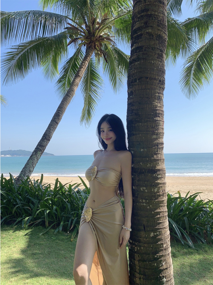 비키니 세트 유럽과 미국식 금속 주름 튜브 탑 작은 조끼 분할 수영복 해변 해변 스커트