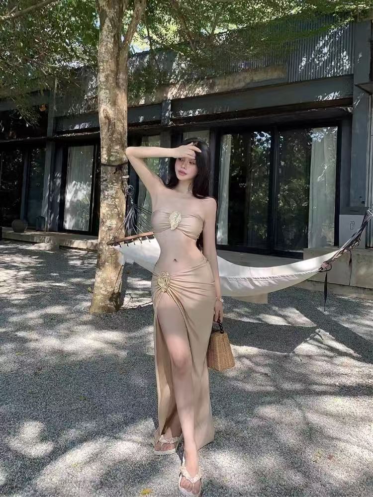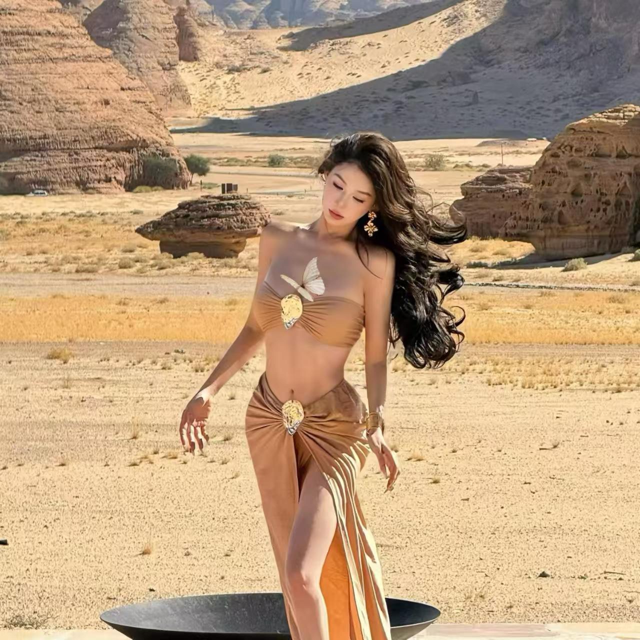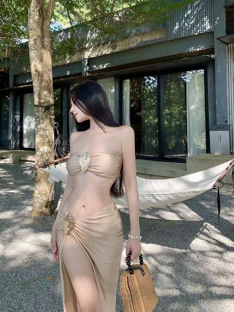 비키니 세트 유럽과 미국식 금속 주름 튜브 탑 작은 조끼 분할 수영복 해변 해변 스커트스토어 가기