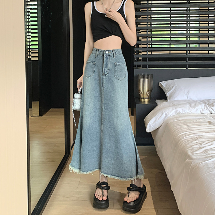녹을 가진 데님 치마 여자 중간 길이의 피쉬 스커트 높은 허리 슬리밍 A-라인 플러스 사이즈 핫 힙 롱 스커트
