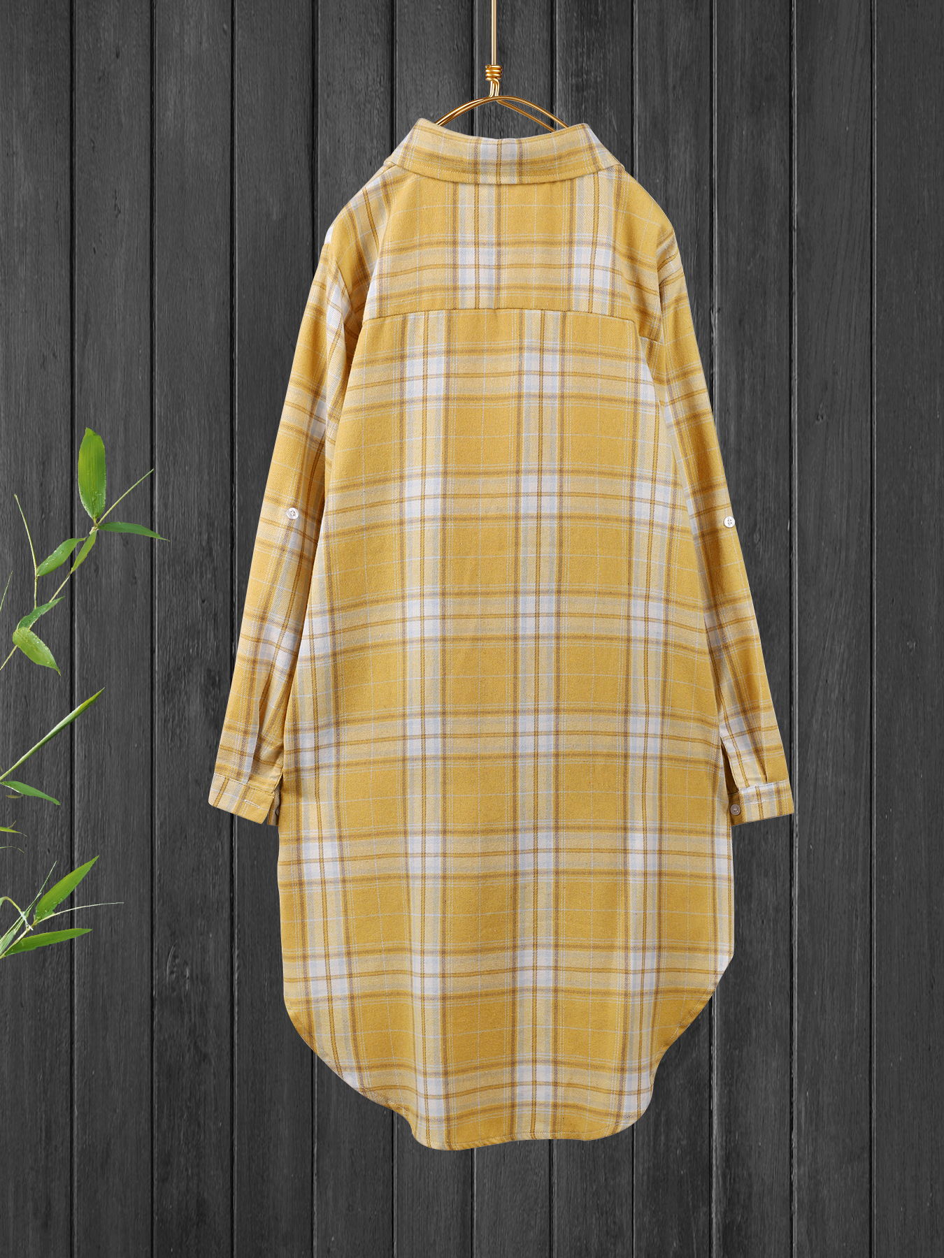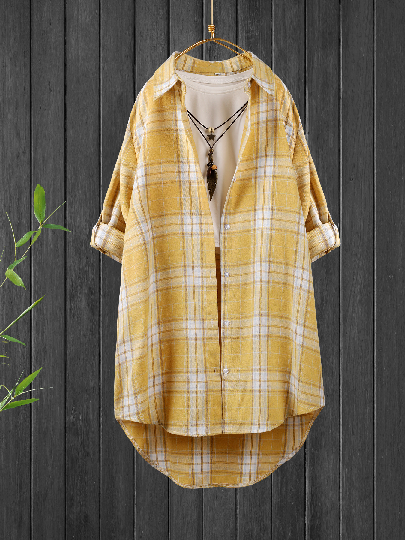 유럽과 미국의 플러스 사이즈 여성 2025 봄 새로운 최고 격자 무늬 긴 소매 느슨한 패션 캐주얼 노란색 격자 무늬 셔츠