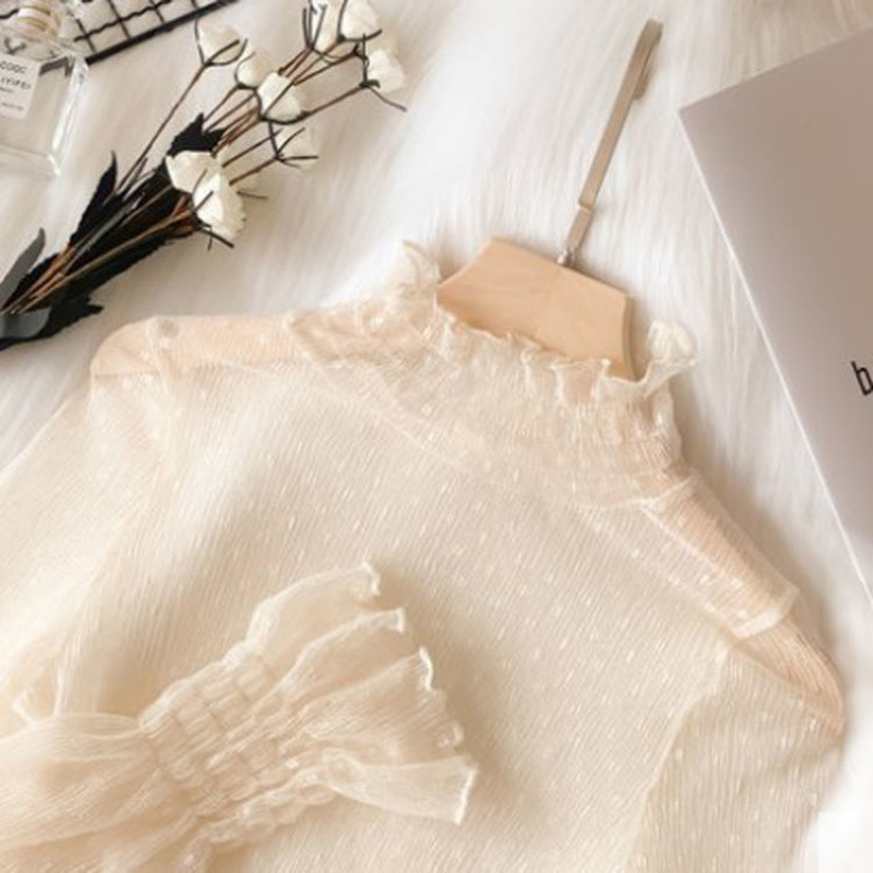 레이스베이스 셔츠 여성의 가을과 겨울 새 스타일 요정 내부 트럼펫 소매 셔츠 반 높이 칼라 폴카 도트 메쉬 탑