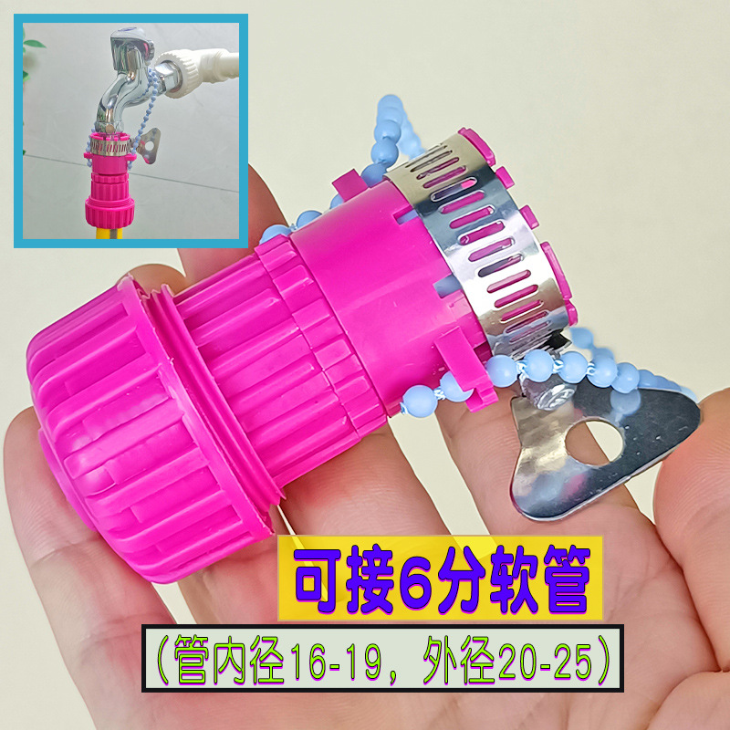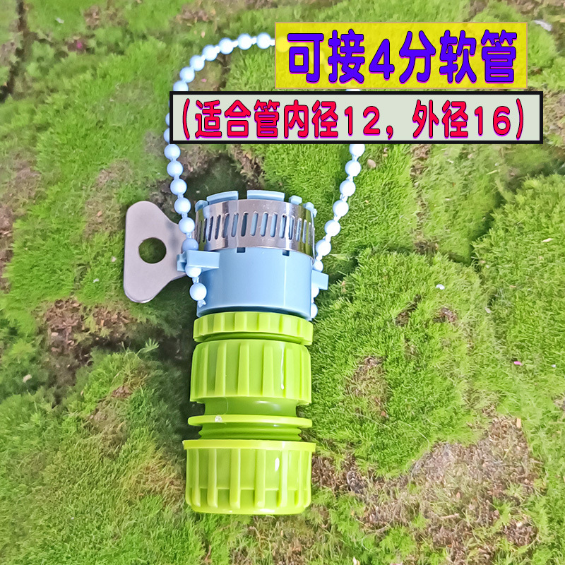 水龙头接头,大流量设计,接头的进水口可以连接水龙头,出水口可以接对应尺寸的软管。一共有3个尺寸的接头,其中4分,6分,1寸管口水龙头接的重量分别是52克,57克,61克,三个接头的尺寸都为42*44*77mm。材质为ABS+PP。带有防脱珠链,连接方便不漏水,非常适合家用,园林灌溉,洗车管使用。1.jpg