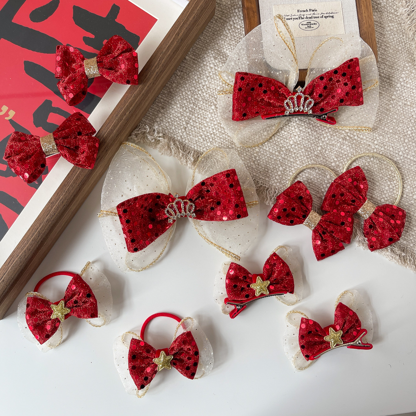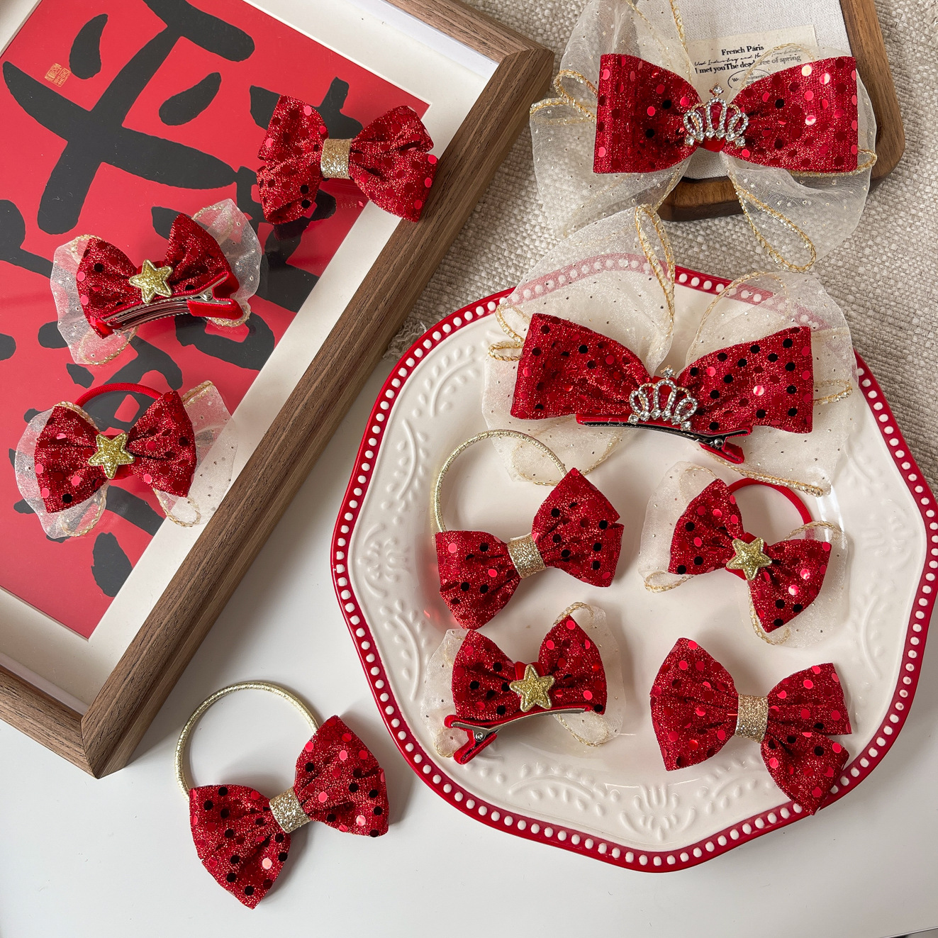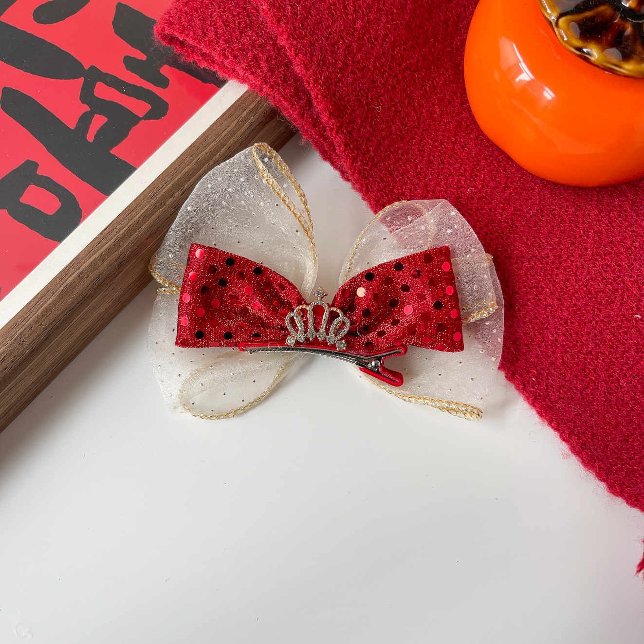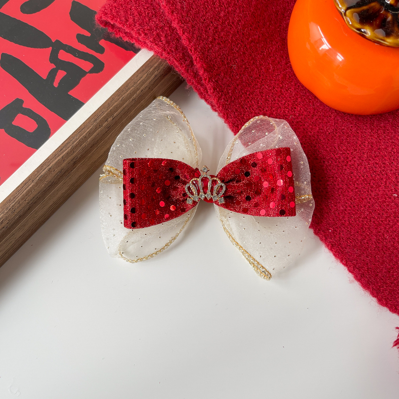 어린이 신년 빨간 활 머리핀 고급 감각 스팽글 나비 머리 반지 부모-자식 밝은 분말 크라운 머리핀 머리 액세서리