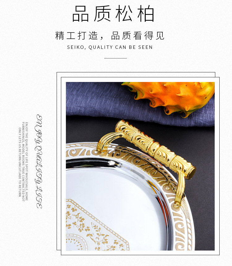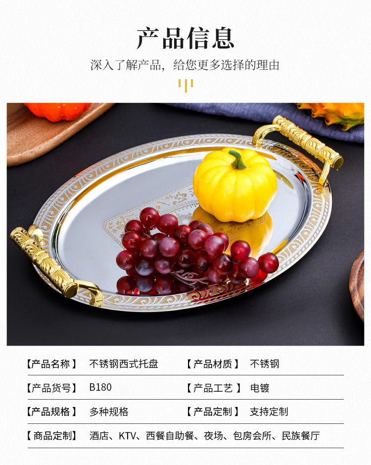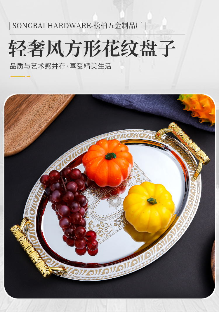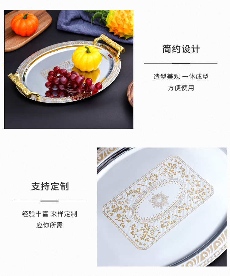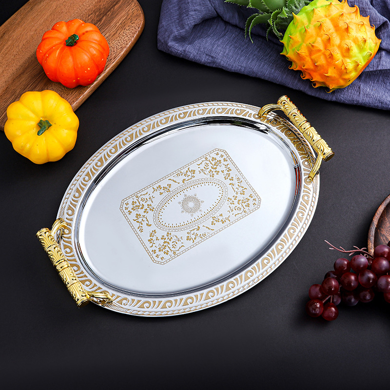 골드 핸들 타원형 빈티지 스테인레스 스틸 트레이 호텔 케이터링 인쇄 트레이 가정용 스낵 과일 저장 트레이 재고