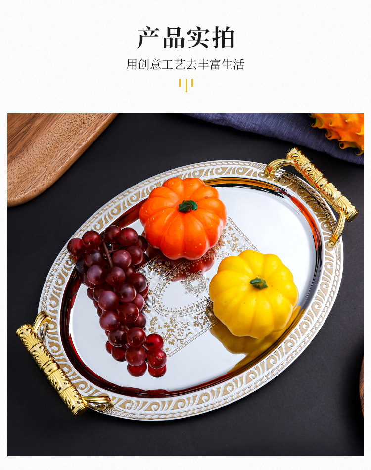 골드 핸들 타원형 빈티지 스테인레스 스틸 트레이 호텔 케이터링 인쇄 트레이 가정용 스낵 과일 저장 트레이 재고스토어 가기